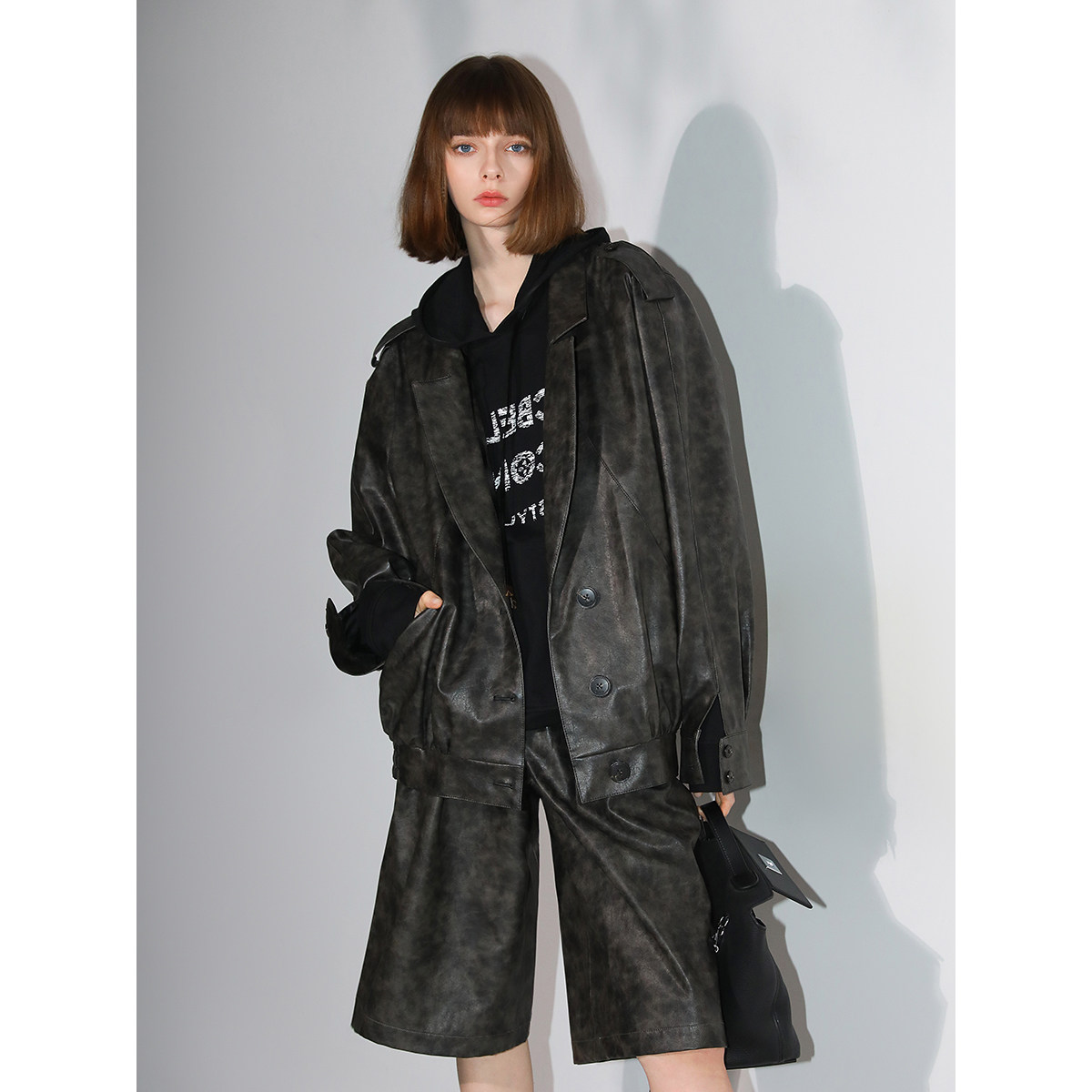 Aurocean 细腻微光泽感环保PU防风衣 短宽廓形连帽皮衣外套