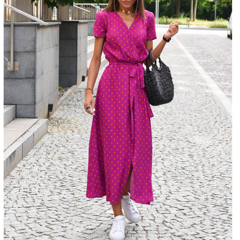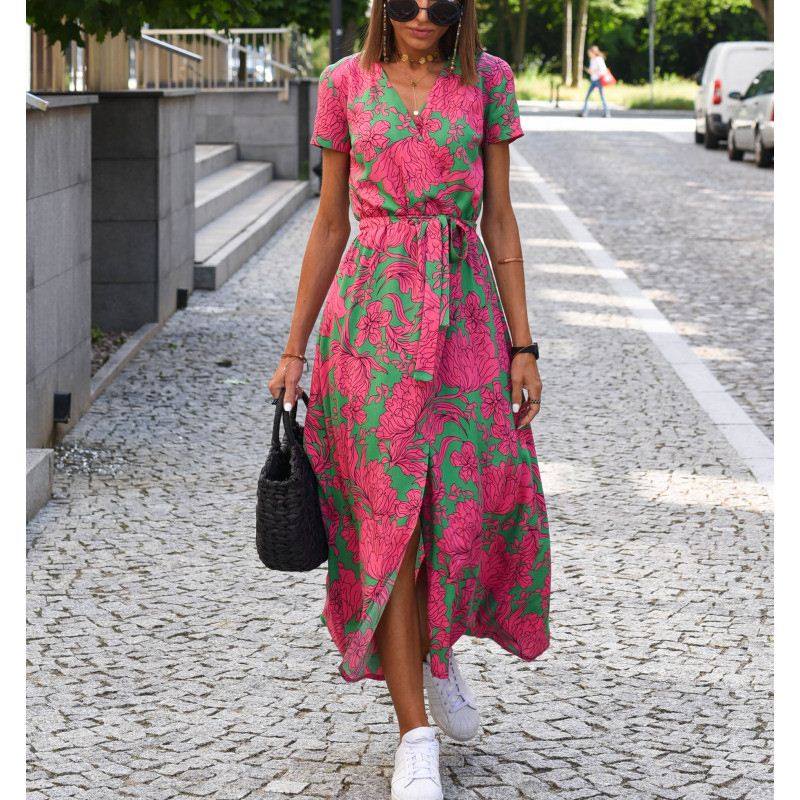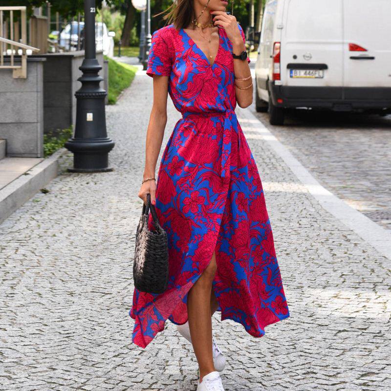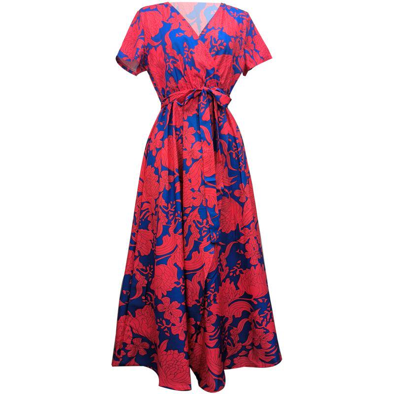 欧美风波西米亚夏女士收腰系带开叉显瘦V领短袖 连衣裙长裙沙滩裙