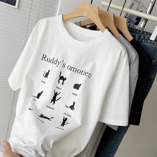 新款 t恤女2023夏季 印花圆领宽松百搭休闲上衣潮 字母猫咪短袖 美式