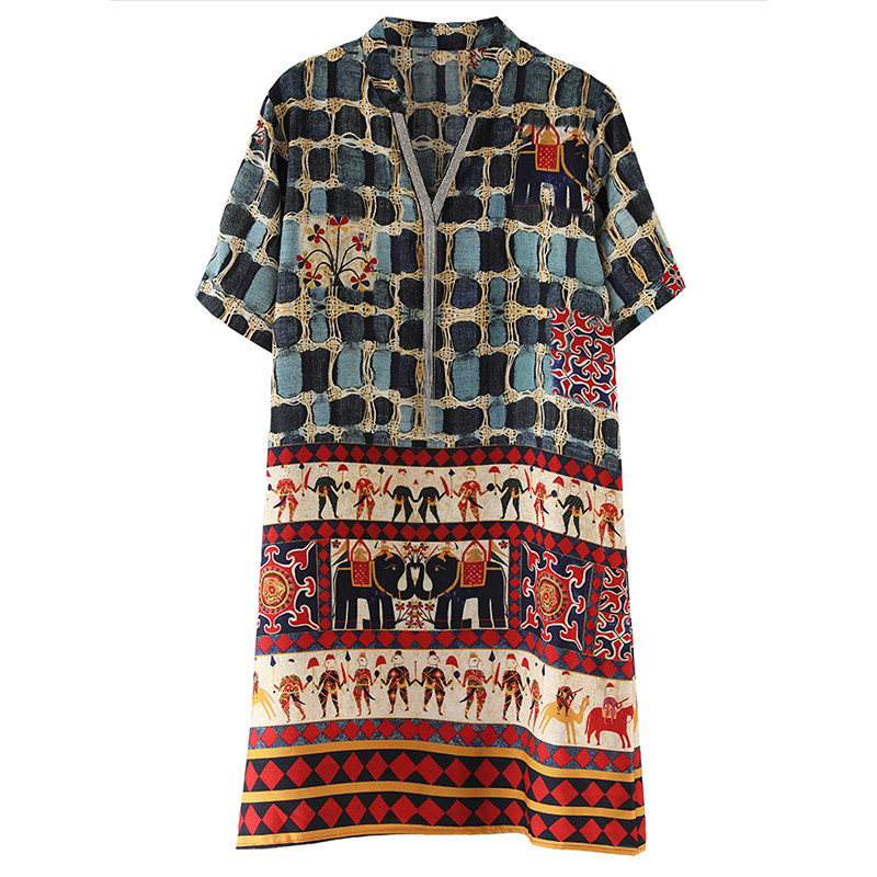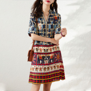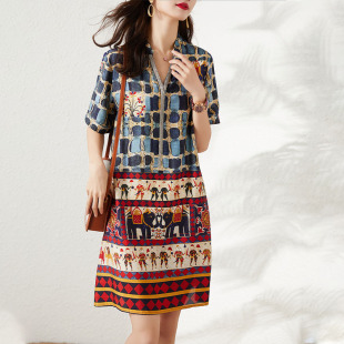 连衣裙潮女 小立V领宽松短袖 胖妹妹民族风印花裙子2026年夏季 新款