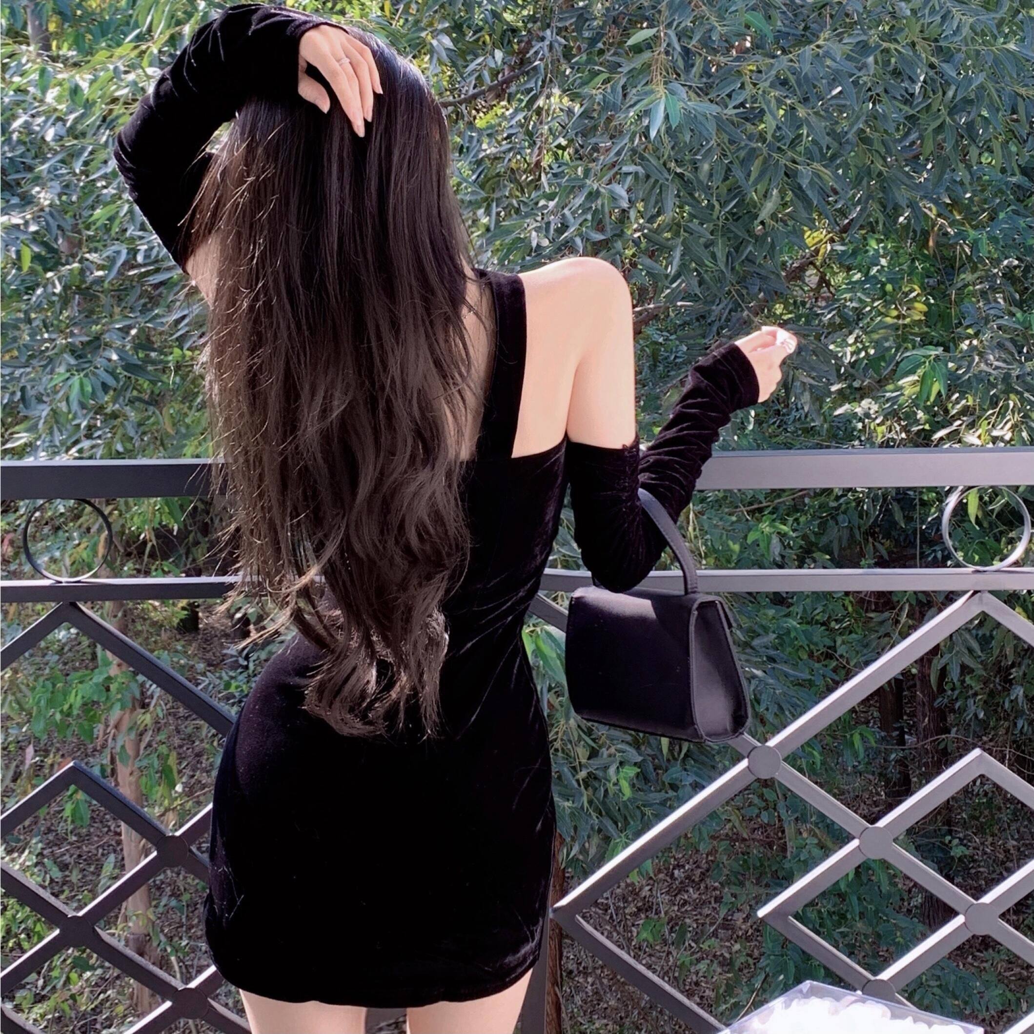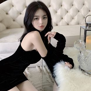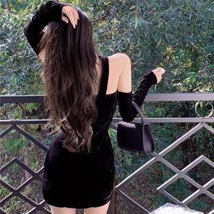 套裙 纯欲辣妹风黑色丝绒连衣裙性感抹胸收腰内搭袖 秋冬装 2024新款