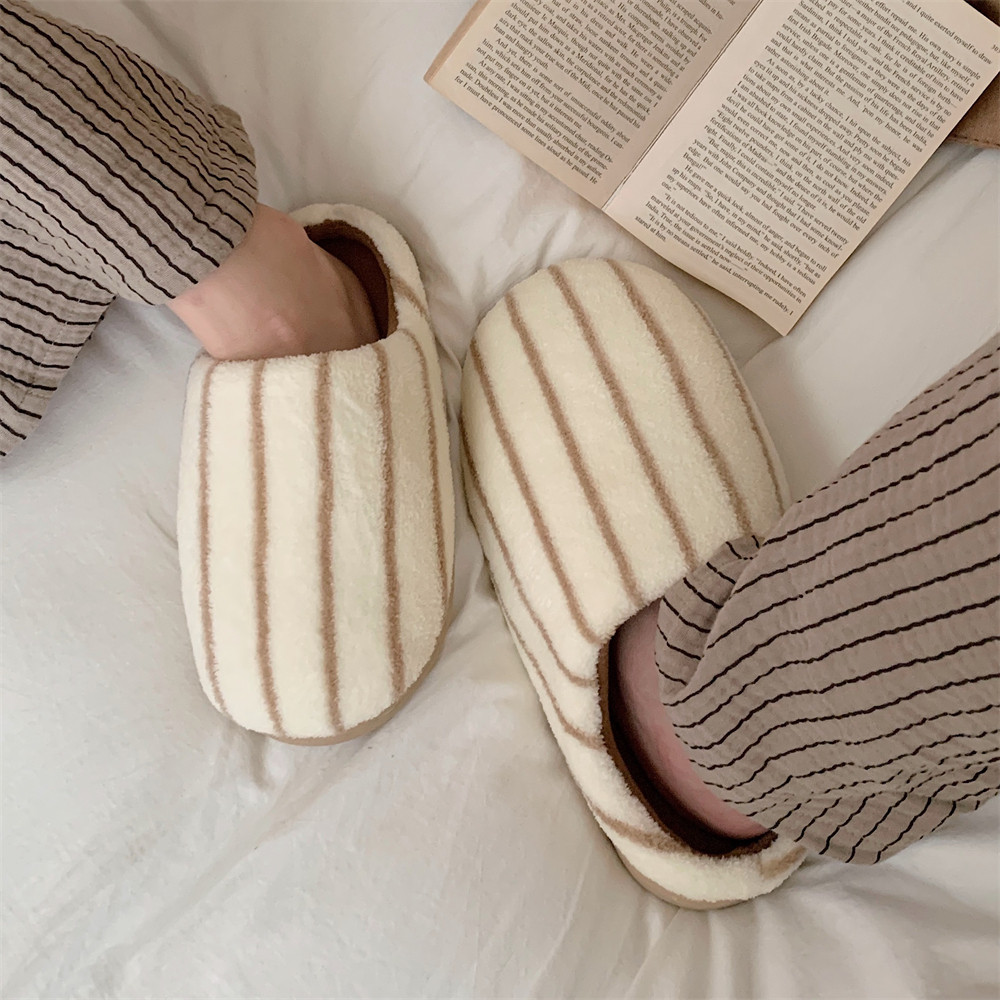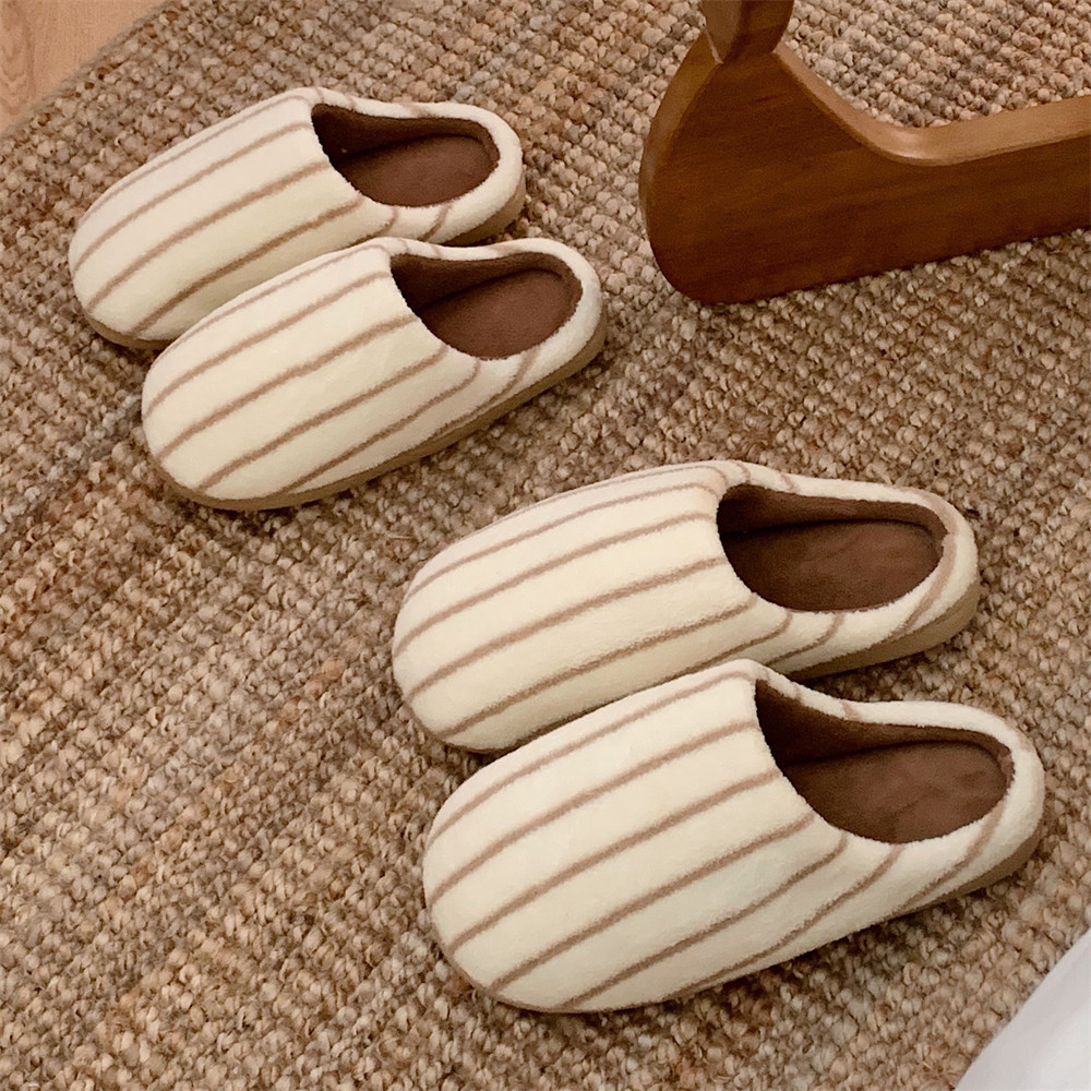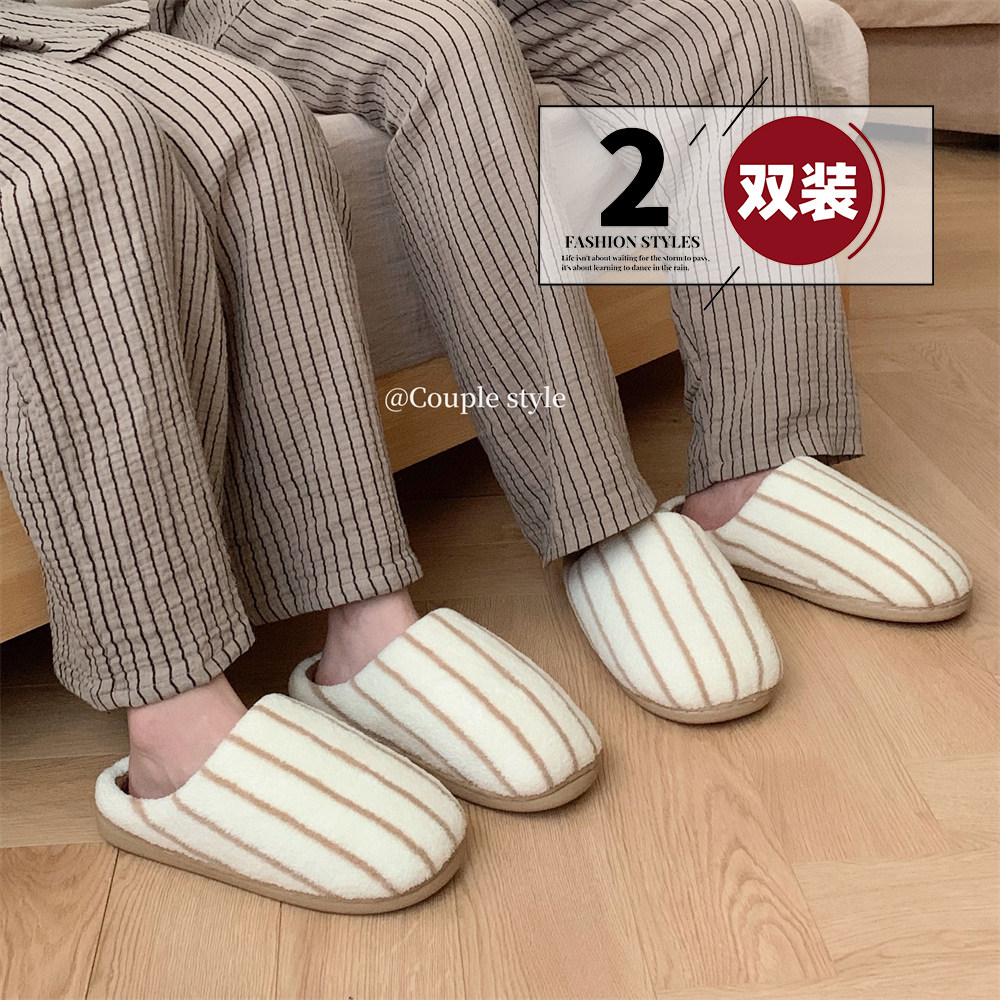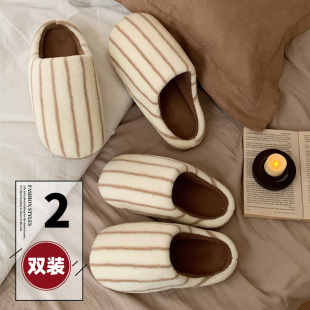 男女保暖小众拼色条纹情侣毛毛鞋 细细条 居家棉拖鞋 冬季 ins 两双装