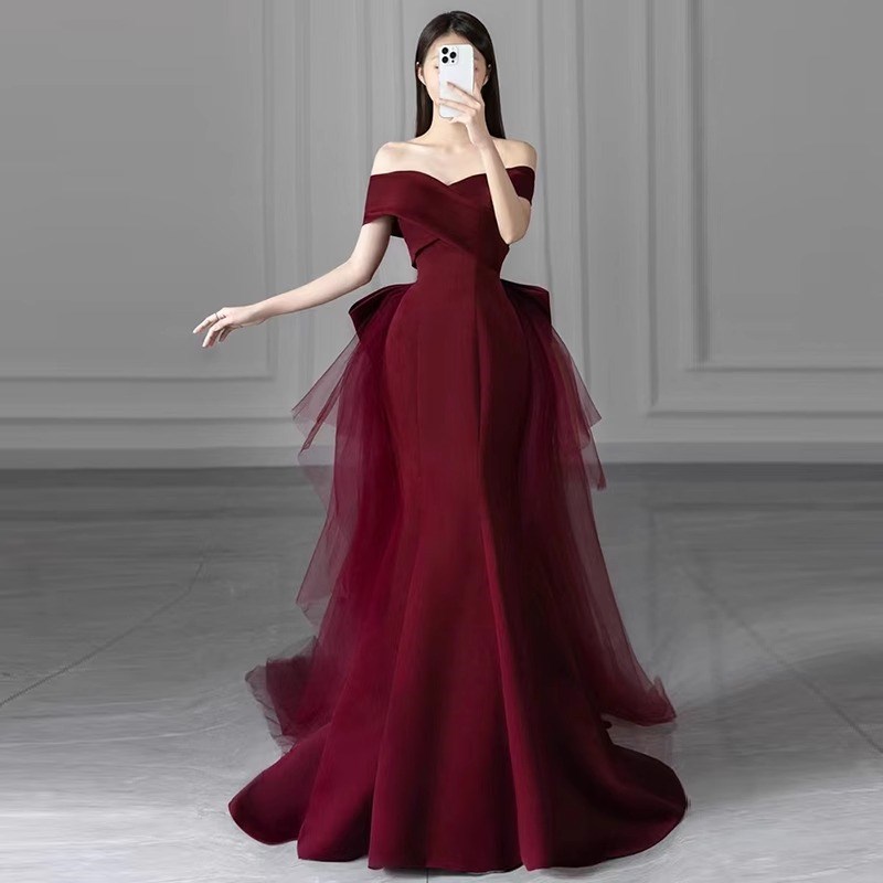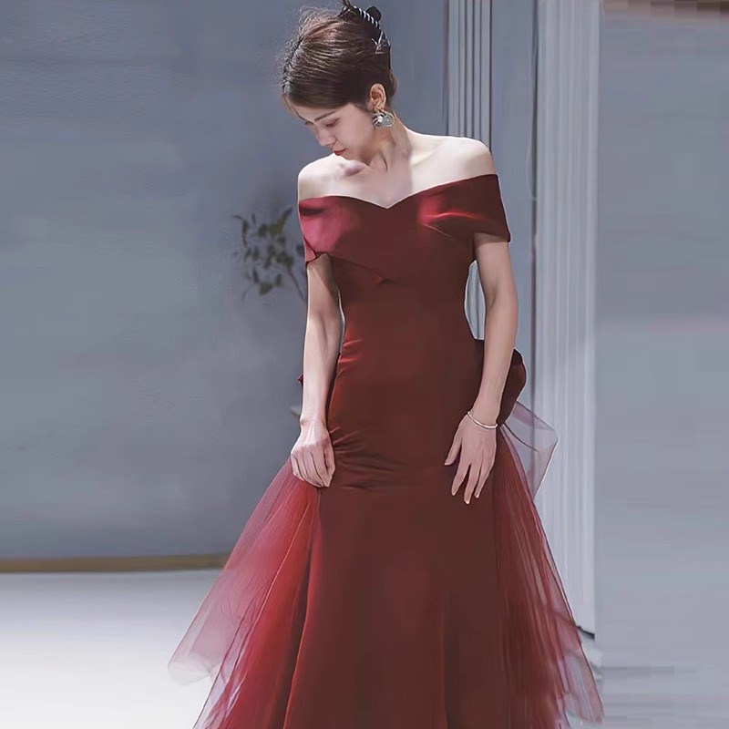 现货速发一字肩新娘敬酒服鱼尾订婚礼服2025新款 年会主持演出服高