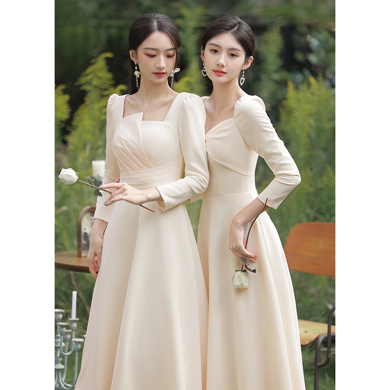 伴娘服租赁香槟色长袖 2025伴姐妹团裙显瘦小个子胖mm平时穿 秋冬季