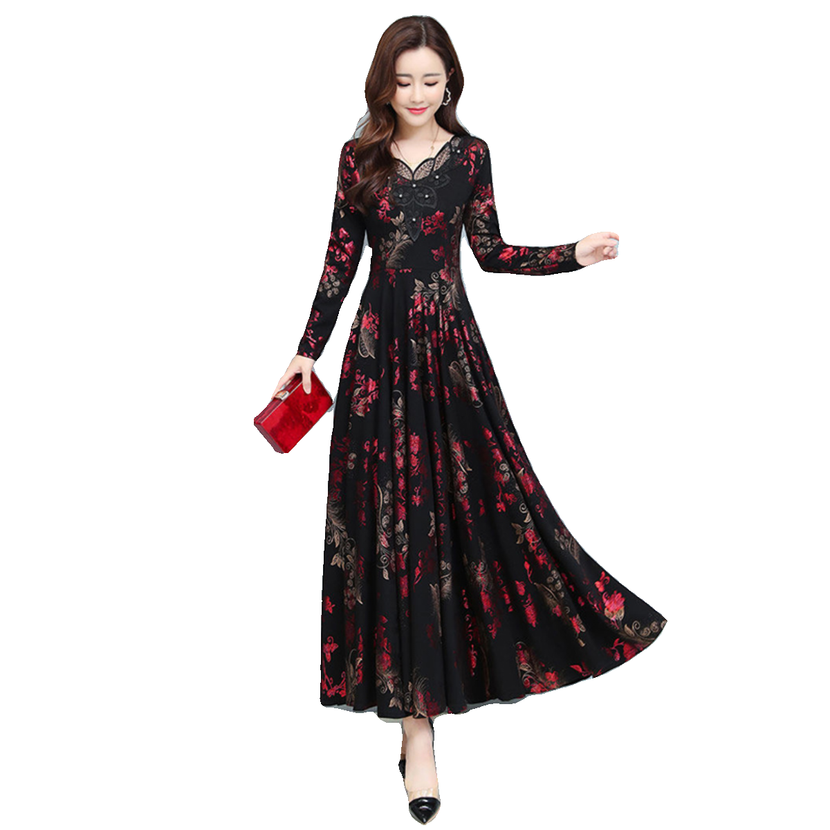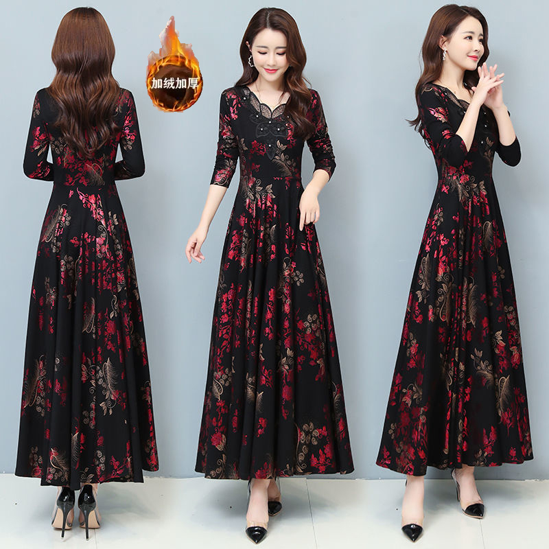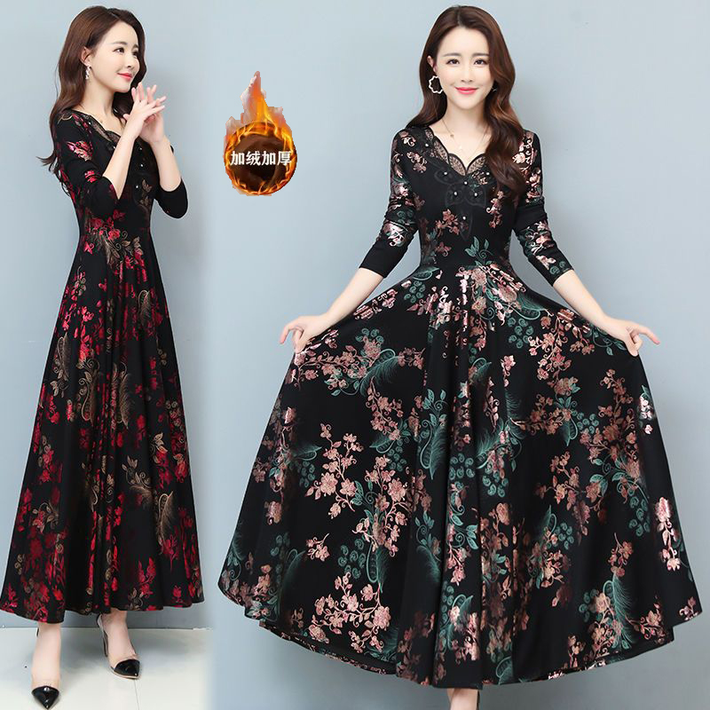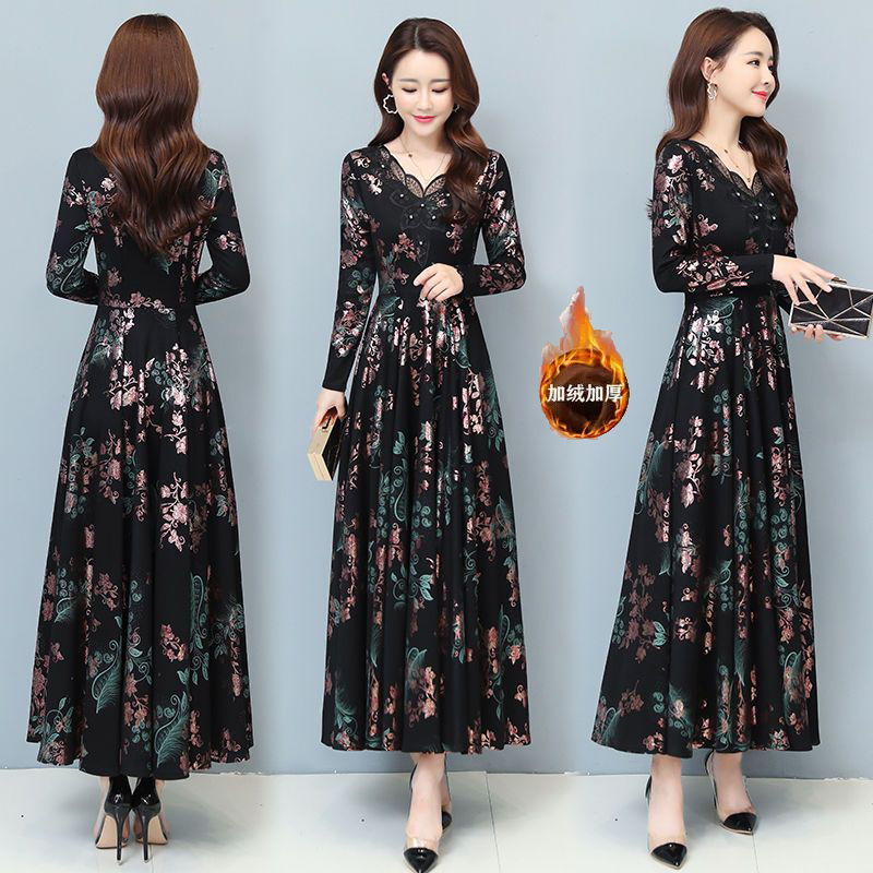 加绒加厚气质妈妈广场舞蕾丝连衣裙碎花中长裙大码 打底裙子 长袖