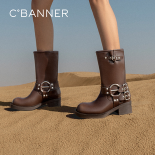 美拉德复古粗跟堆堆西部牛仔靴 新款 真皮 内增高短靴女2025年秋季