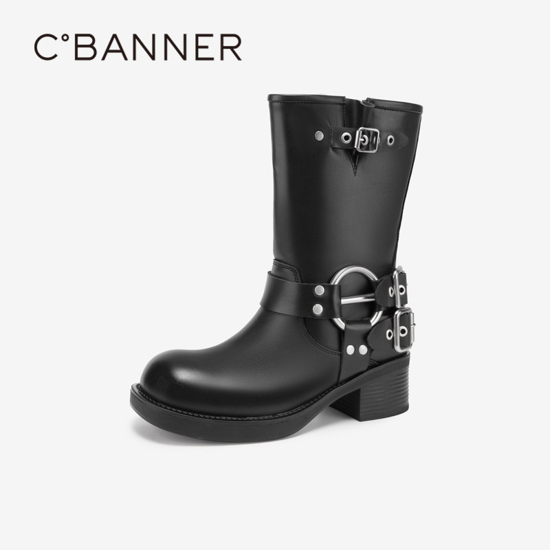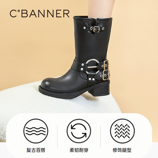 真皮 管靴女堆堆靴长筒靴骑士靴西部牛仔靴 骄屿皮带扣黑色中筒裤