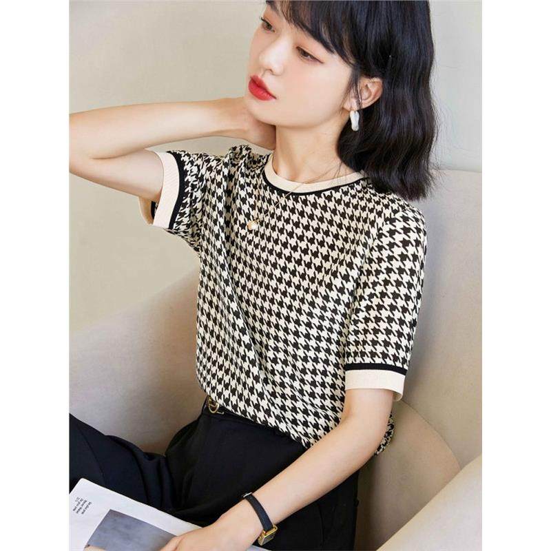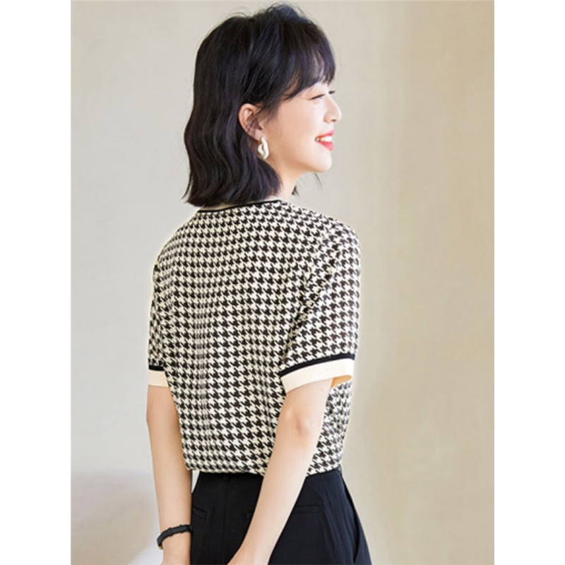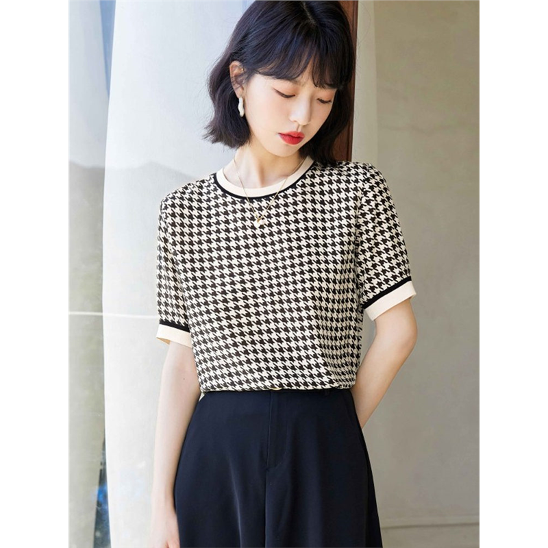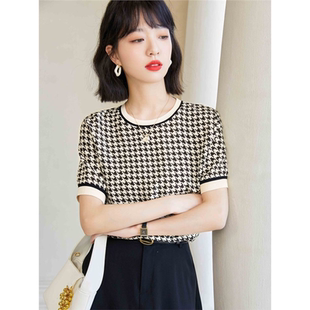 气质千鸟格圆领短袖 正品 法式 2025春夏新款 减龄T恤上衣 哥家新女装