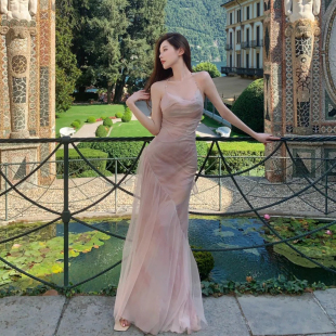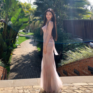 少量现货cameyliu粉色荡领挂脖吊带连衣裙后背蝴蝶结礼服裙deesse