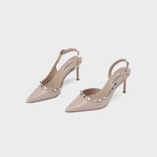 尖头侧空柳丁裸色一字扣包头气质凉鞋 铆钉高跟鞋 女细跟2025夏新款