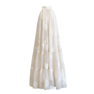 签儿2026春夏新款 复古杏色刺绣挂脖连衣裙露肩大摆度假风长裙 法式