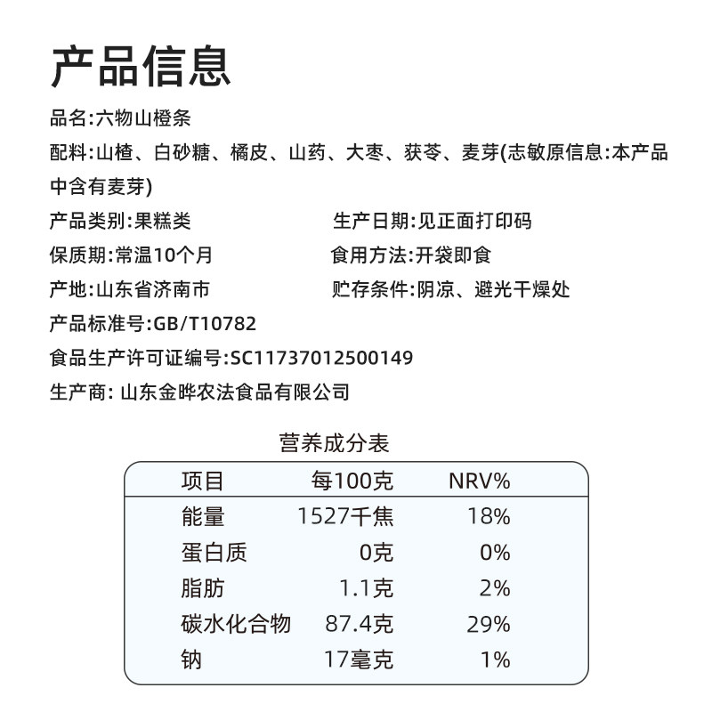 金晔六物山楂条无添加防腐剂酸甜可口独立包装 蜜饯果脯零食