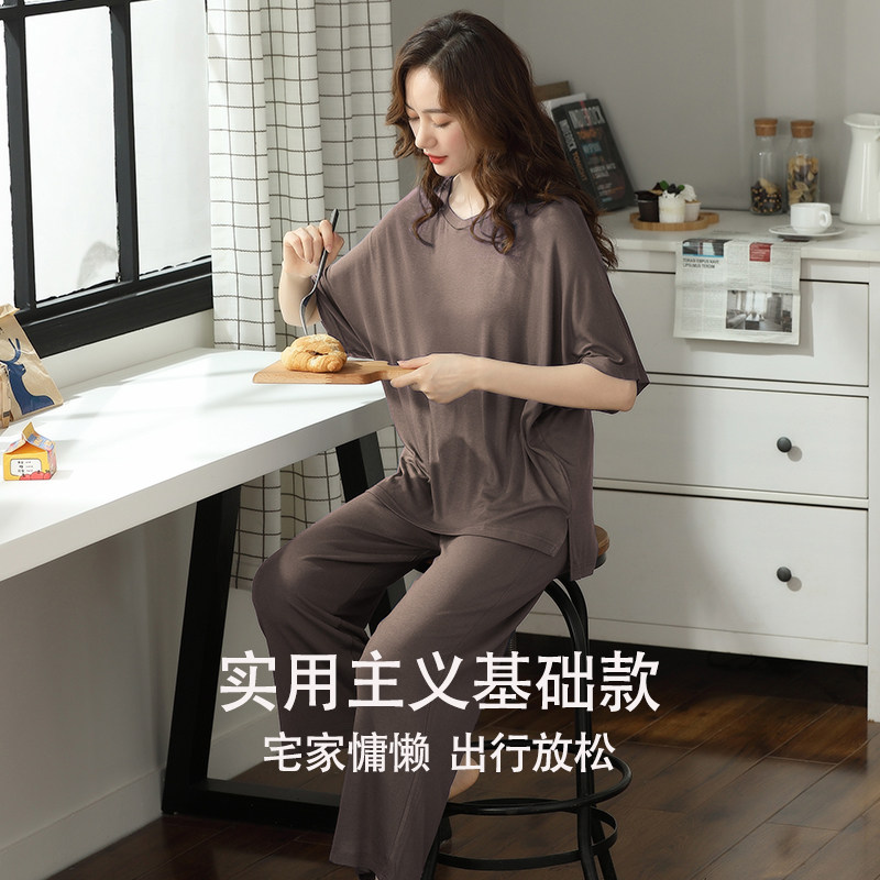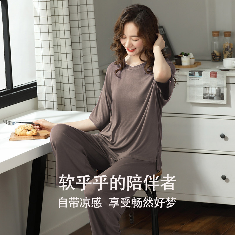 夏款 睡衣女夏季 夏天冰丝女士休闲宽松大码 长裤 女家居服 莫代尔短袖