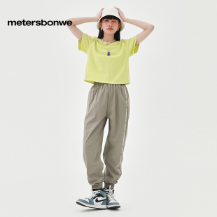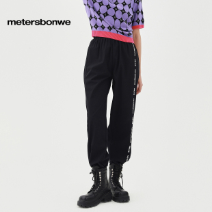 卫裤 印花拼字母织带梭织弹力休闲裤 女 潮流女时尚 美特斯邦威26春季