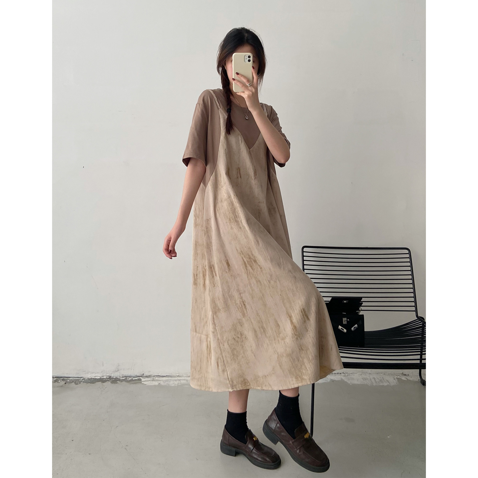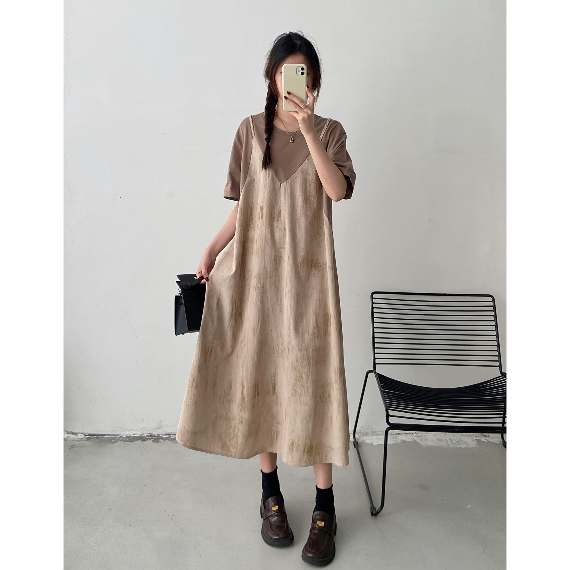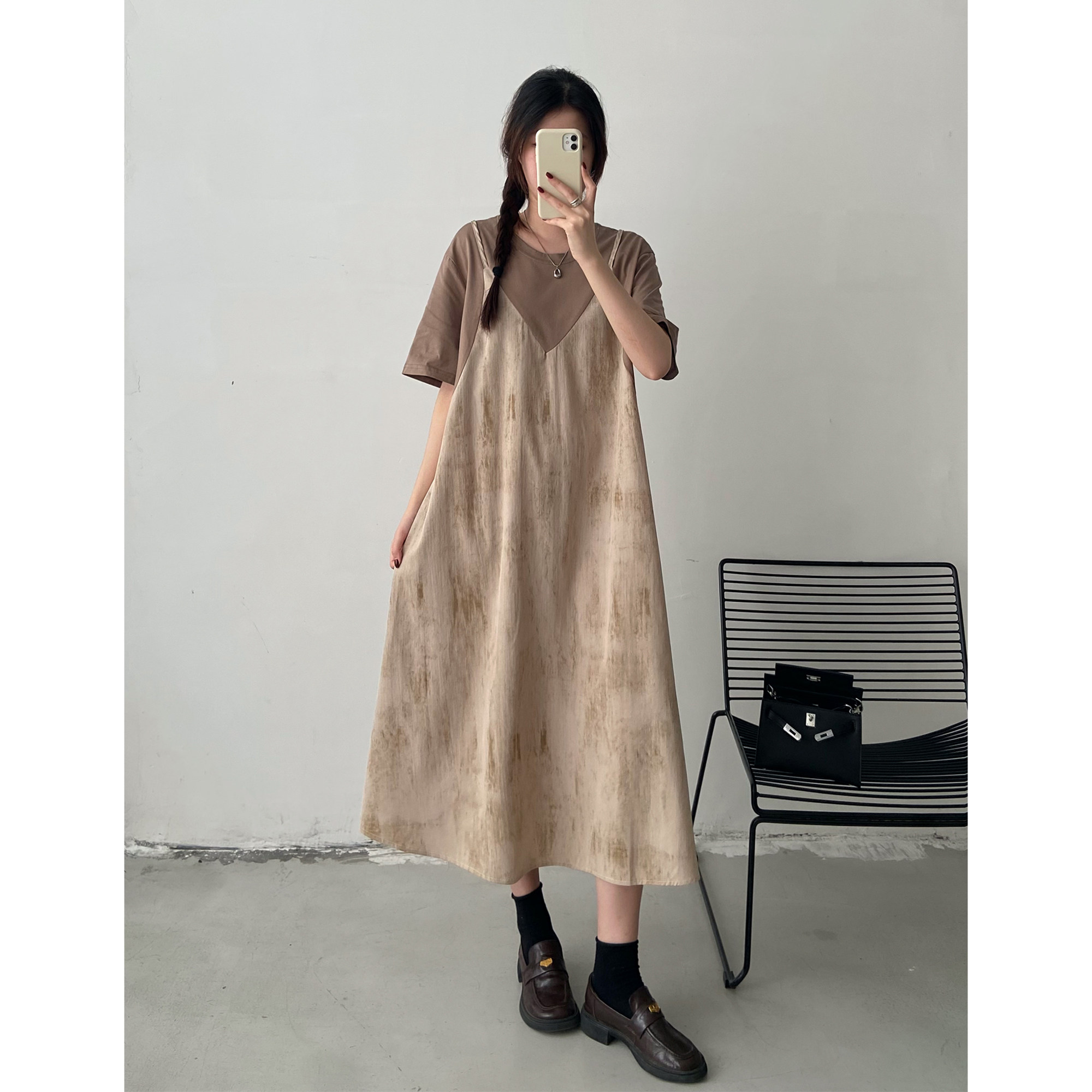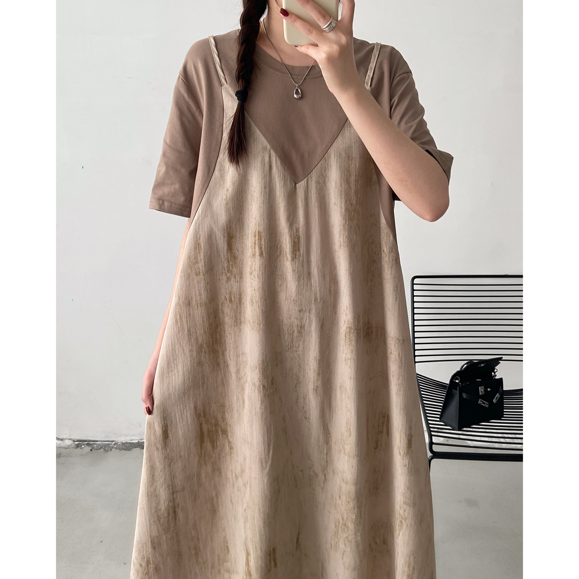 胖mm宽松遮肚子t恤裙 大码 设计感扎染吊带假两件连衣裙女夏季 新款