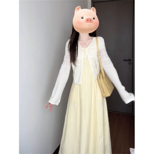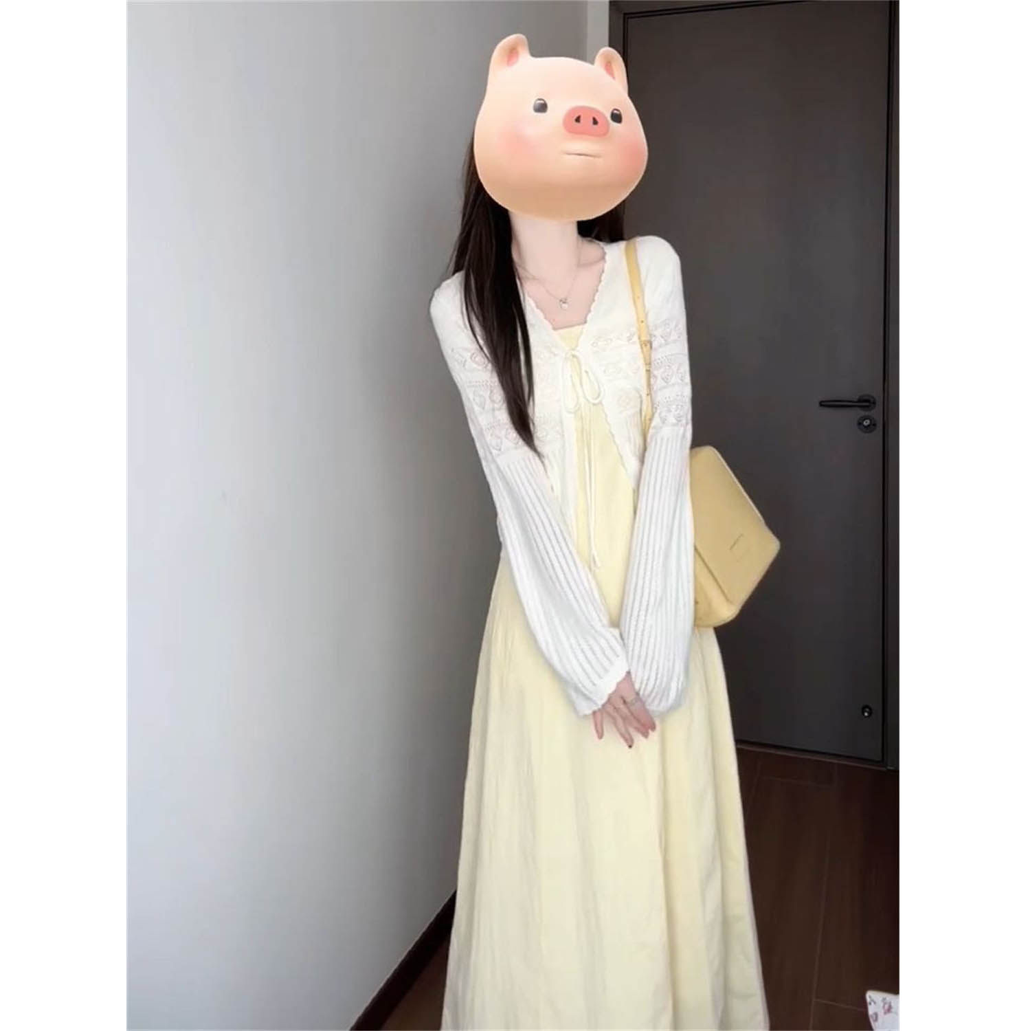 荷叶防晒罩衫 初恋感温柔风奶黄色收腰背带裙 学生女 新款 2025春季