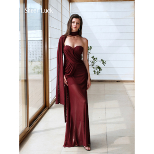 褶皱设计不对称鱼尾长裙连衣裙 Kira网纱飘带修身 Sheer Luck