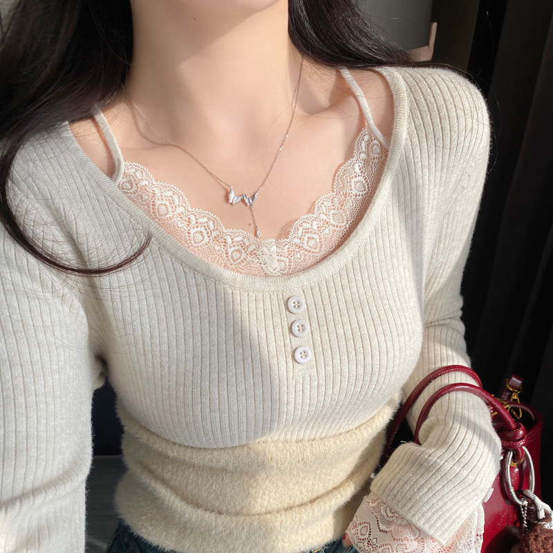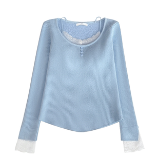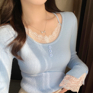 加绒加厚毛衣内搭针织衫 新款 上衣 女2025秋冬季 黄色蕾丝圆领打底衫