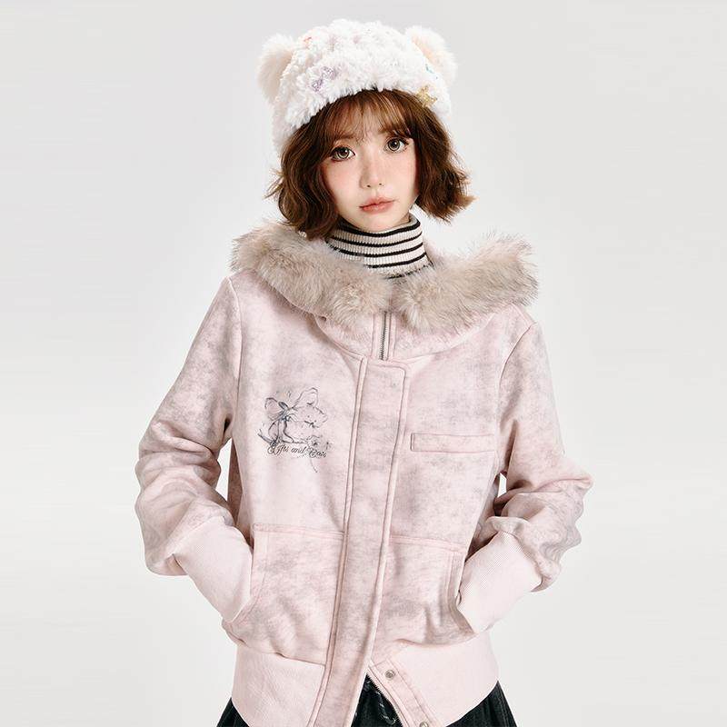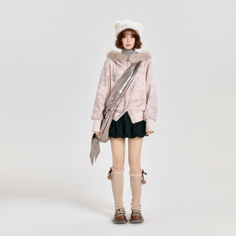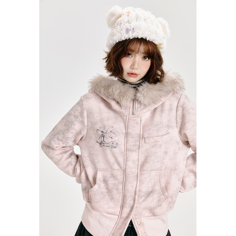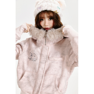 连帽开衫 设计感修身 卫衣 灰粉色毛领外套女春秋新款 Girlyhalo美式