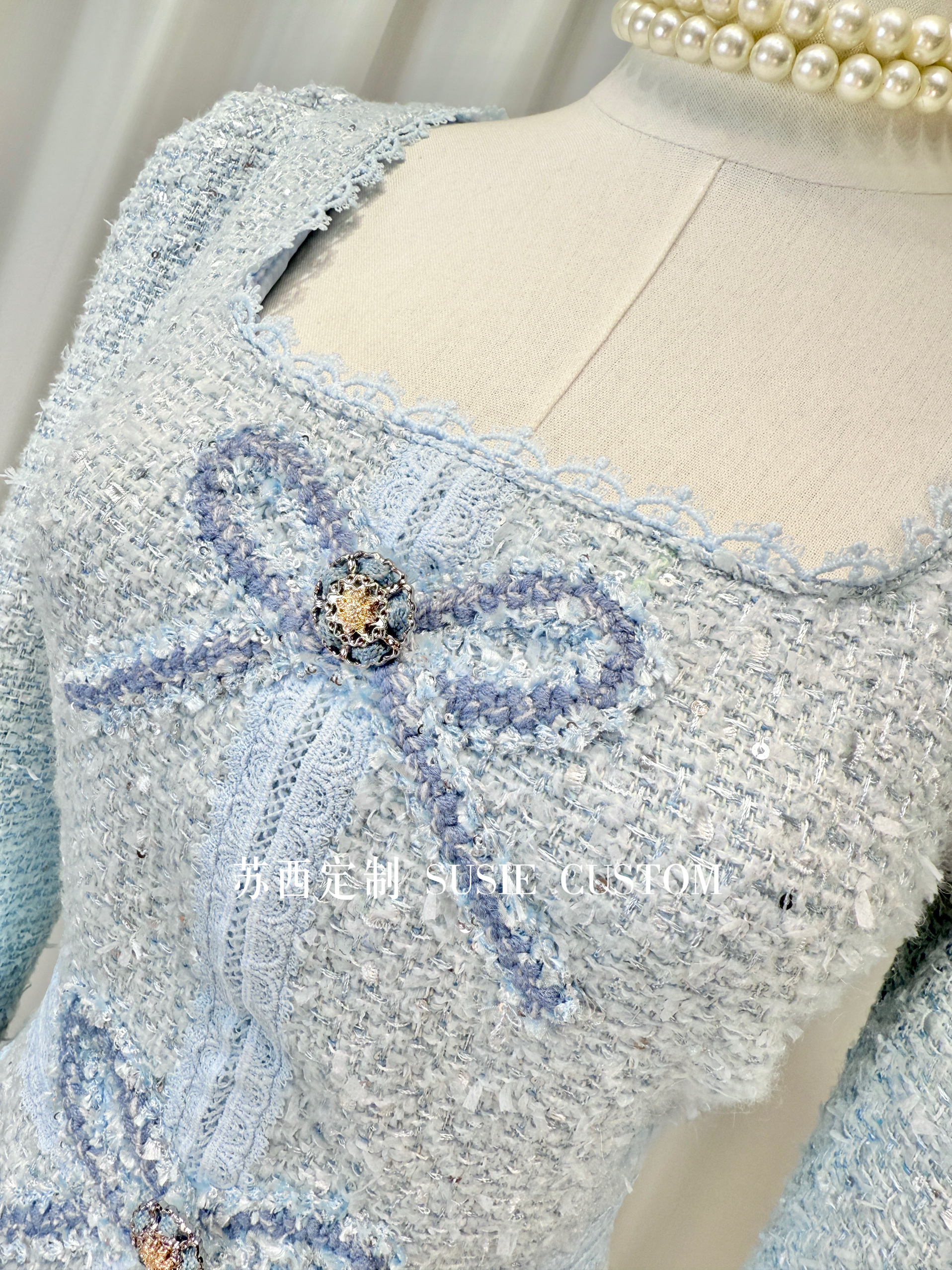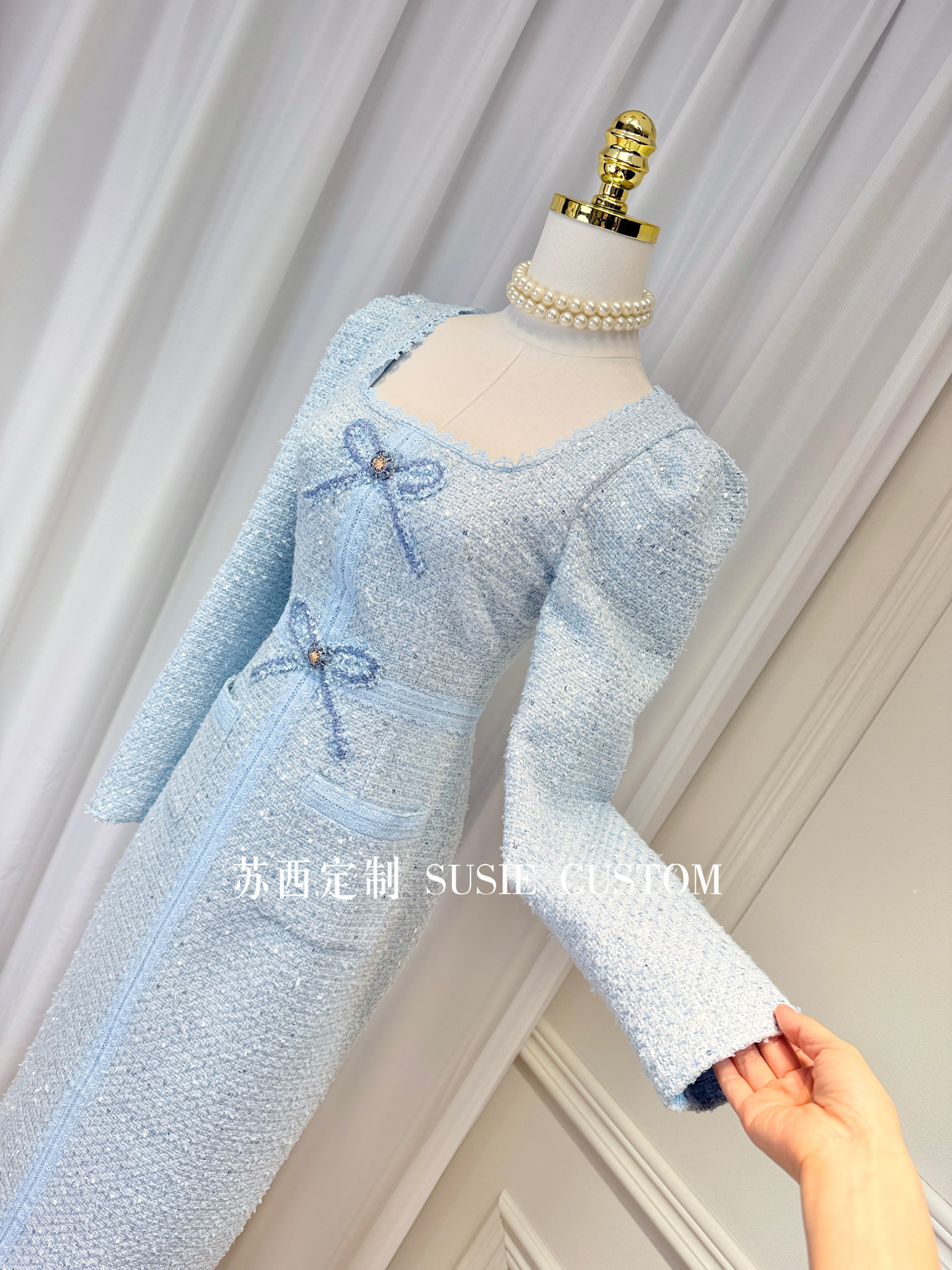 收腰中长款 蝴蝶结口袋修身 开叉粗呢小香连衣裙 方领泡泡袖 高定法式