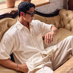 亚麻口袋休闲工装 欧美棉麻皱布衬衫 防晒开衫 透气短袖 衬衣潮 男薄款