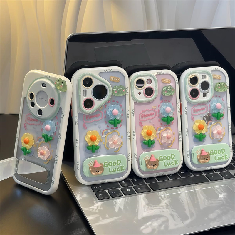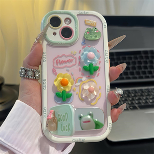 白色flower花适用苹果16promax镜面支架奶油手机壳iphone15防摔华为P70可爱华为mate70pro简约小米小众红米80