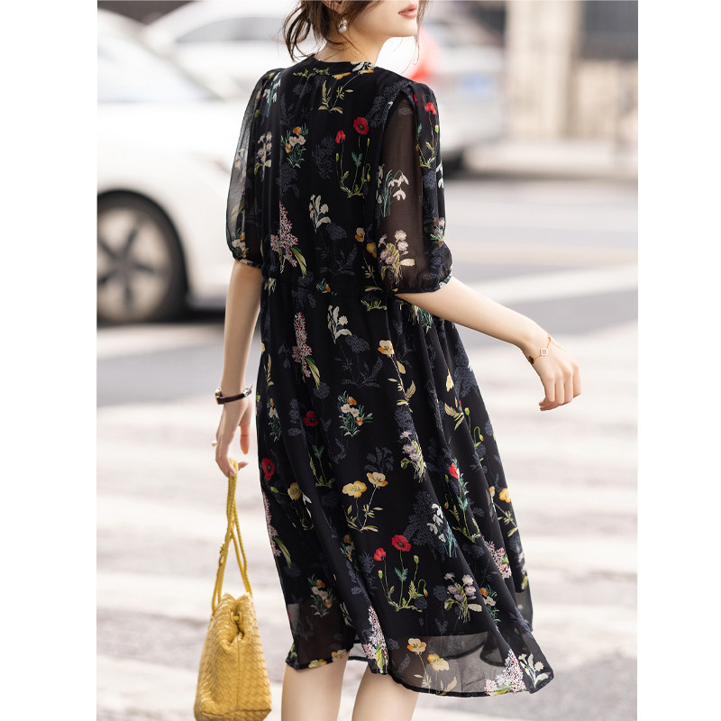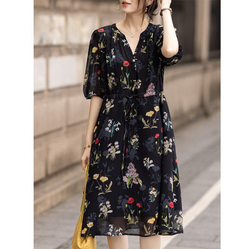 九月陌墨大码 显瘦遮肚雪纺裙 女气质复古V领碎花连衣裙夏2025新款