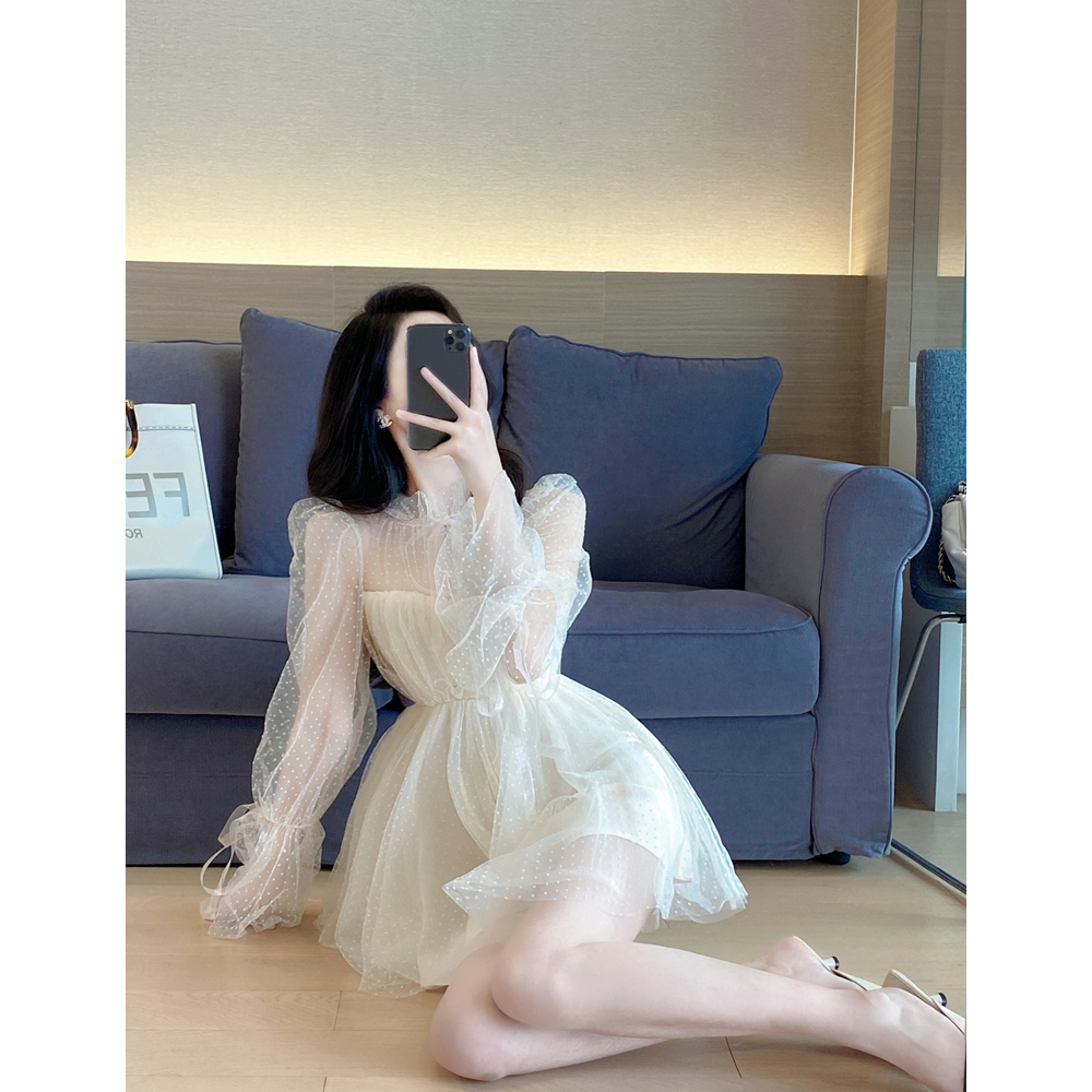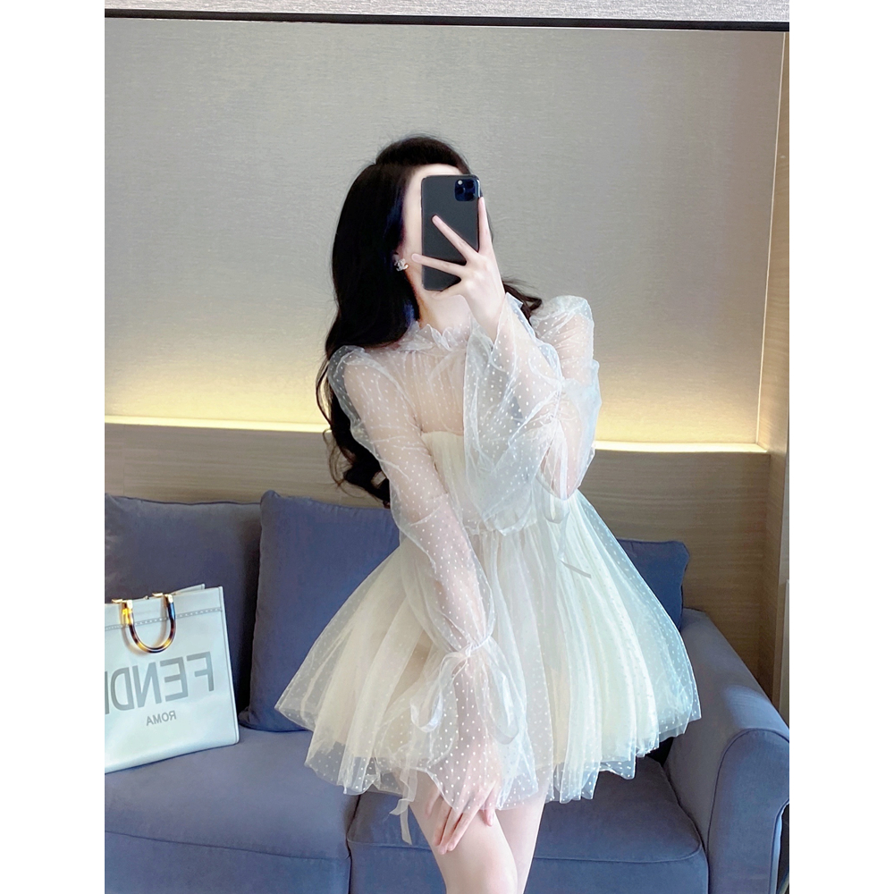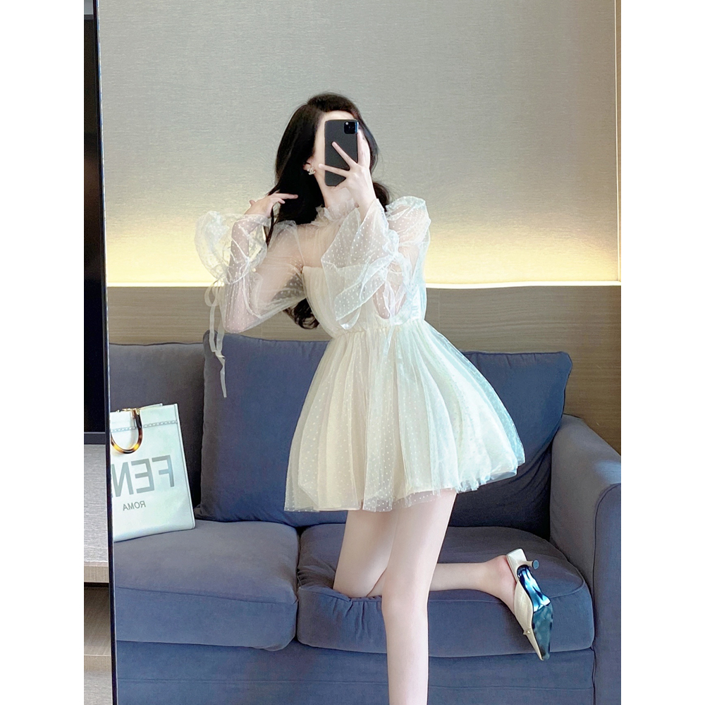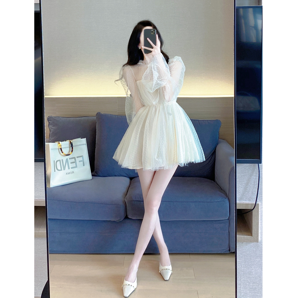 蓬蓬裙2023春秋新款 气质收腰显瘦可爱甜美纱网a字公主裙连衣裙女