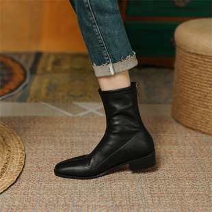 极简百搭 CHIC韩国棕色方头平跟弹力短靴瘦瘦靴女单靴 巨巨好穿