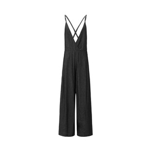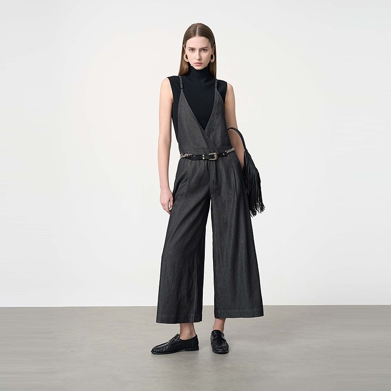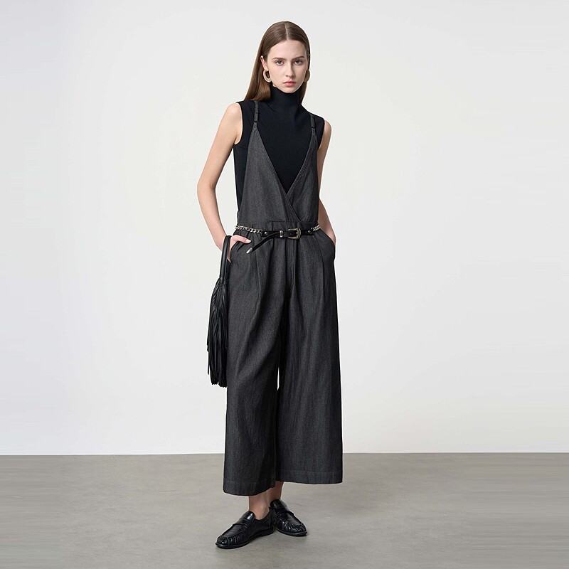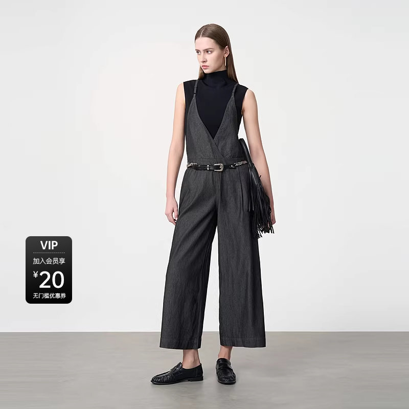 优雅压褶牛仔阔腿背带裤 法式 S24281003 女装 sdeer圣迪奥夏季