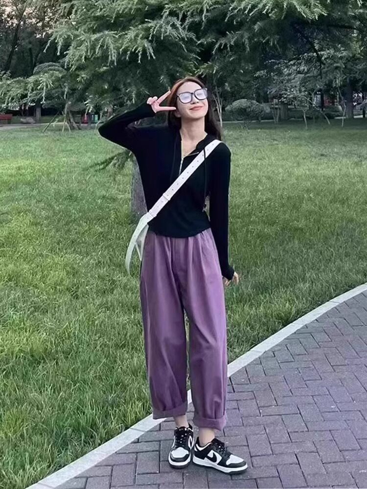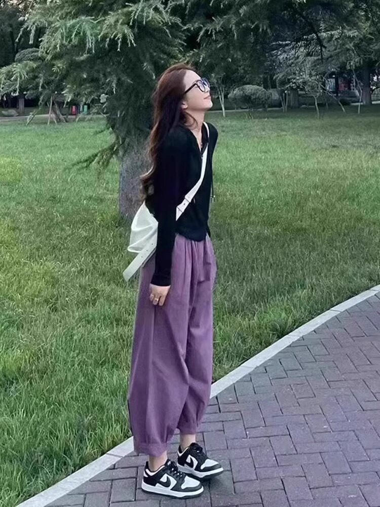xxs码 百搭八九分哈伦萝卜裤 女夏季 矮小个子145七分紫色棉麻休闲裤