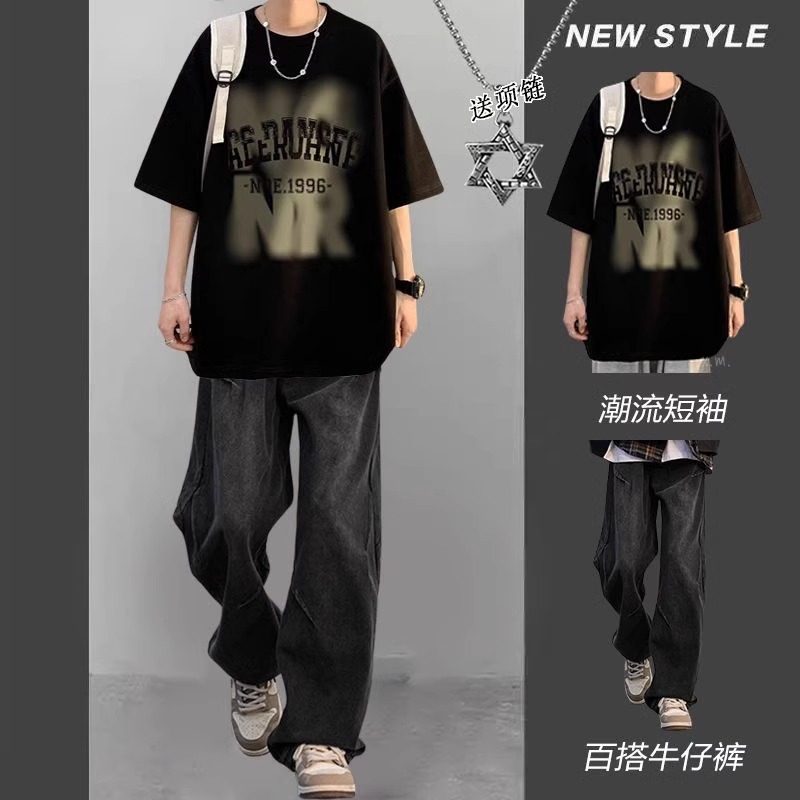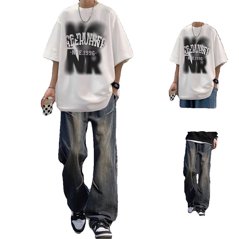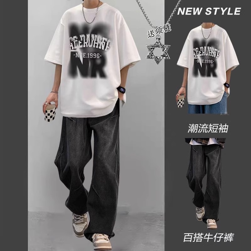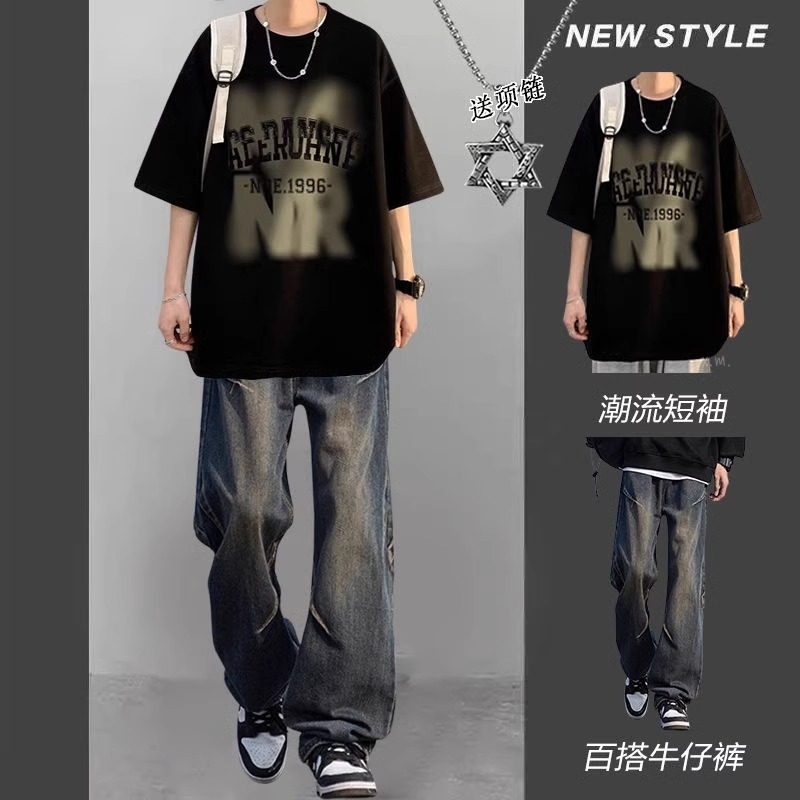 美式 一套搭配牛仔裤 复古痞帅套装 T恤男潮流男装 炸街 酷系短袖 夏季