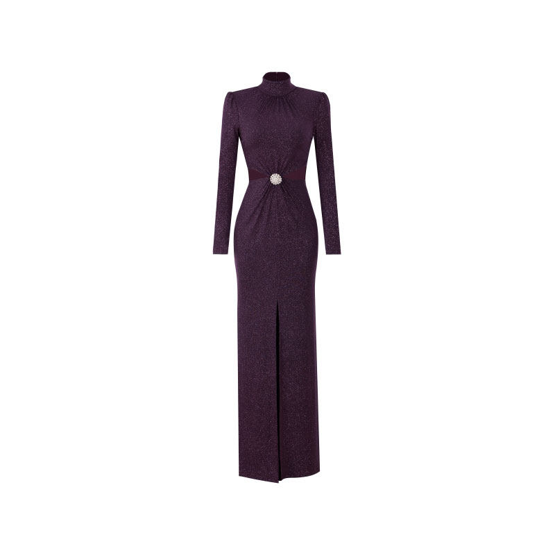 XULU原创初秋纯色烫粉鱼尾裙气质性感露腰立体珠花半高领连衣裙