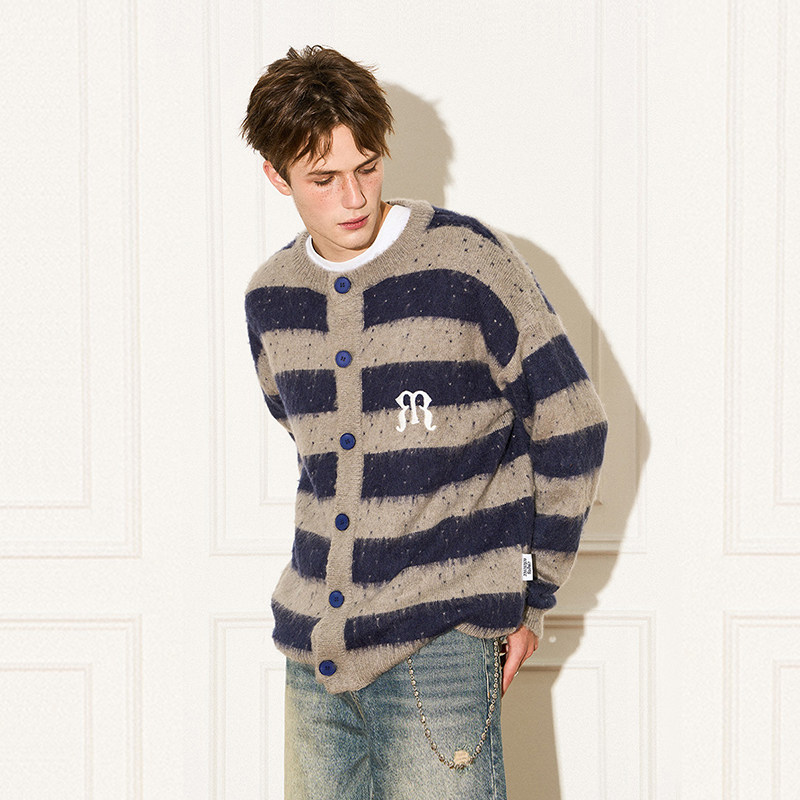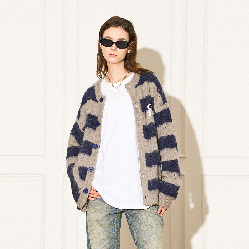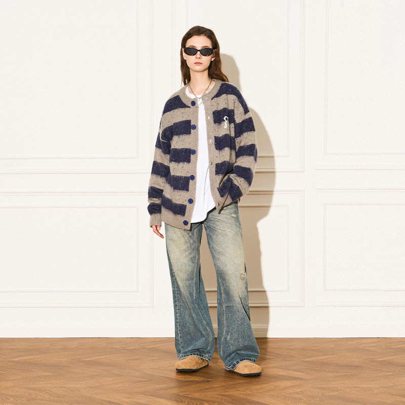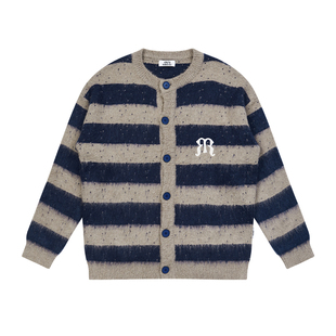 蓝灰条纹刺绣马海毛羊毛开衫 特惠7折 REFERENCE EMPTY 何与