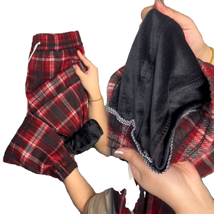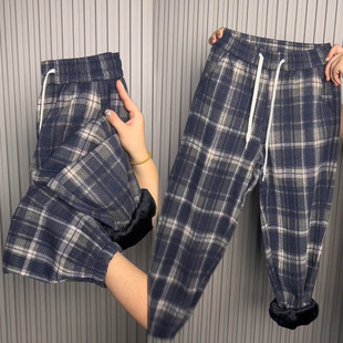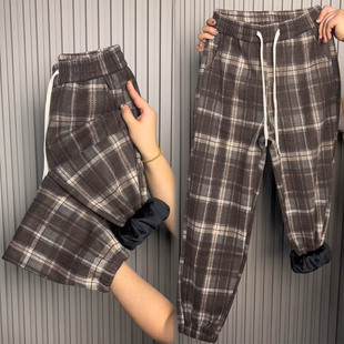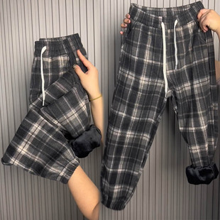 高腰显瘦卫裤 加绒毛呢格子休闲裤 宽松加厚束脚哈伦裤 新款 女冬季