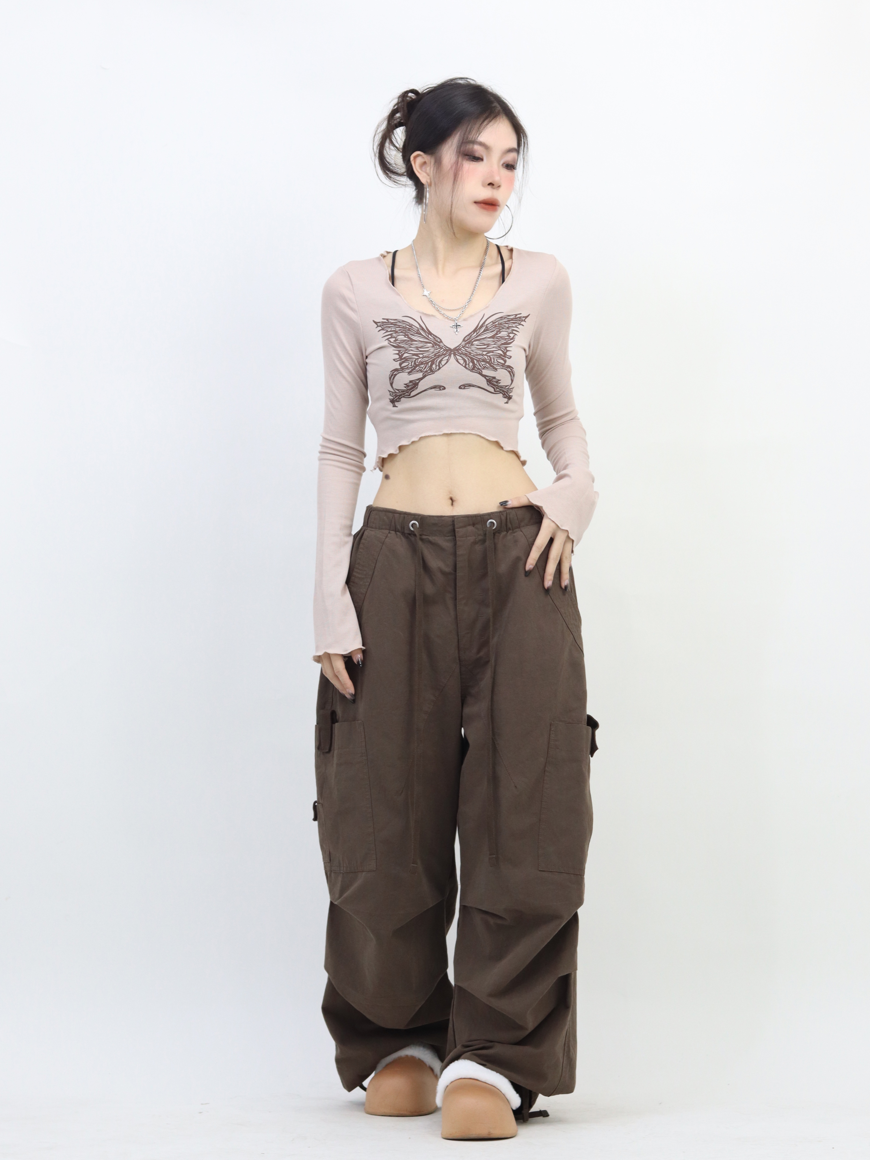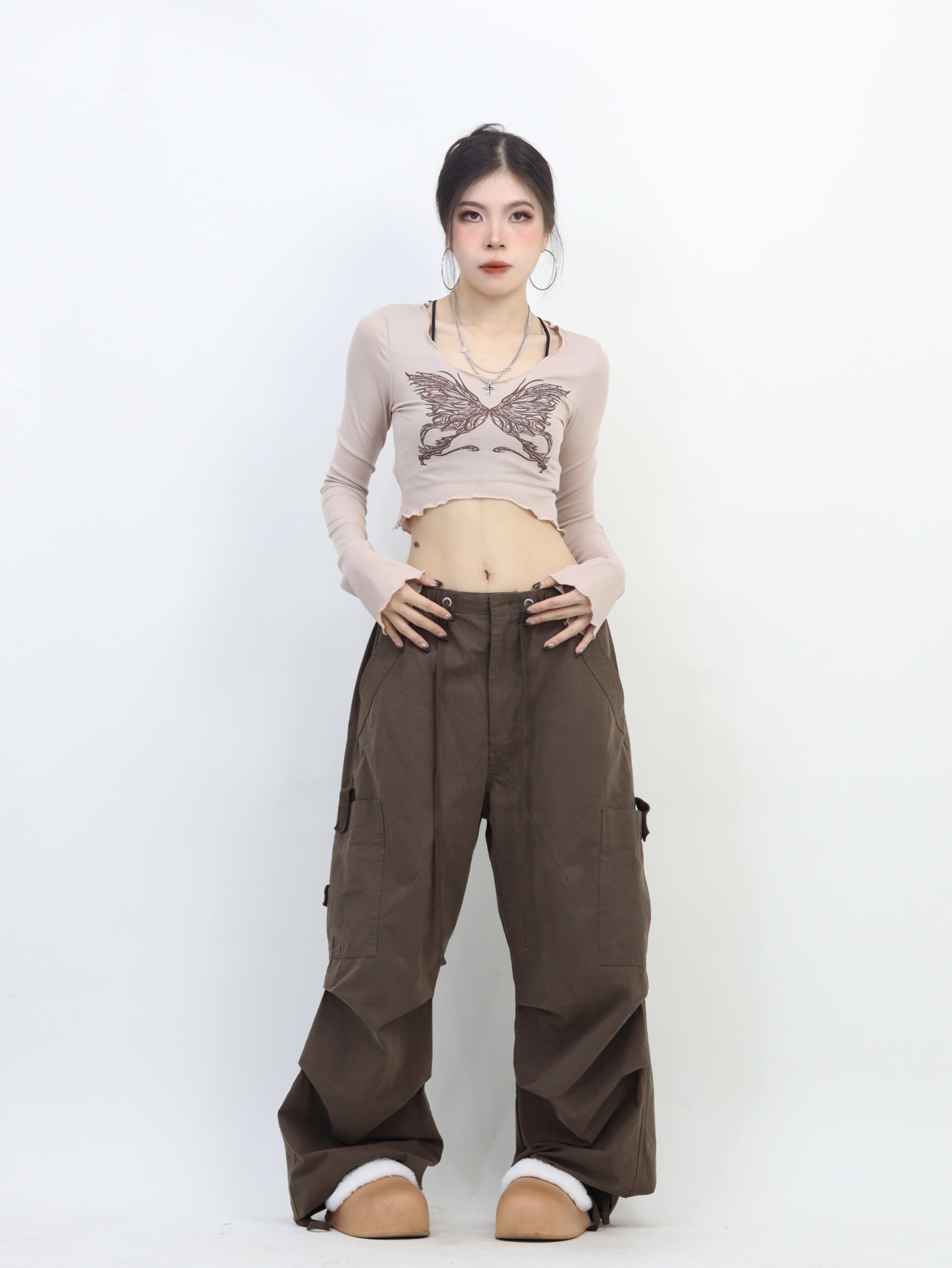 大佬街舞潮牌蝴蝶辣妹图案露脐长袖 休闲4139 T恤显瘦jazz美式