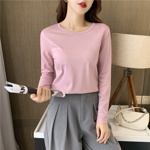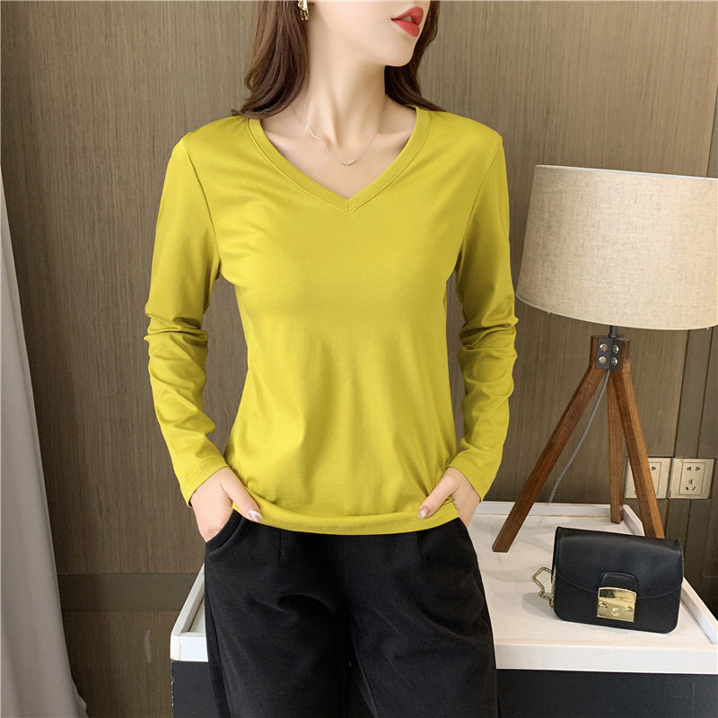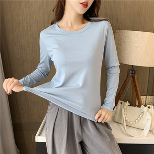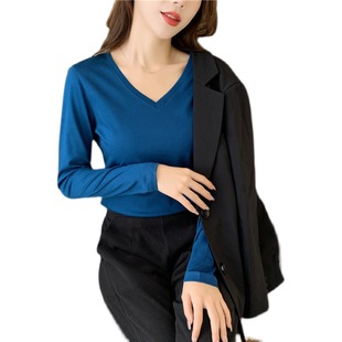 显瘦百搭打底衫 修身 内搭上衣 女t恤V领秋季 80支双面丝光棉白色长袖
