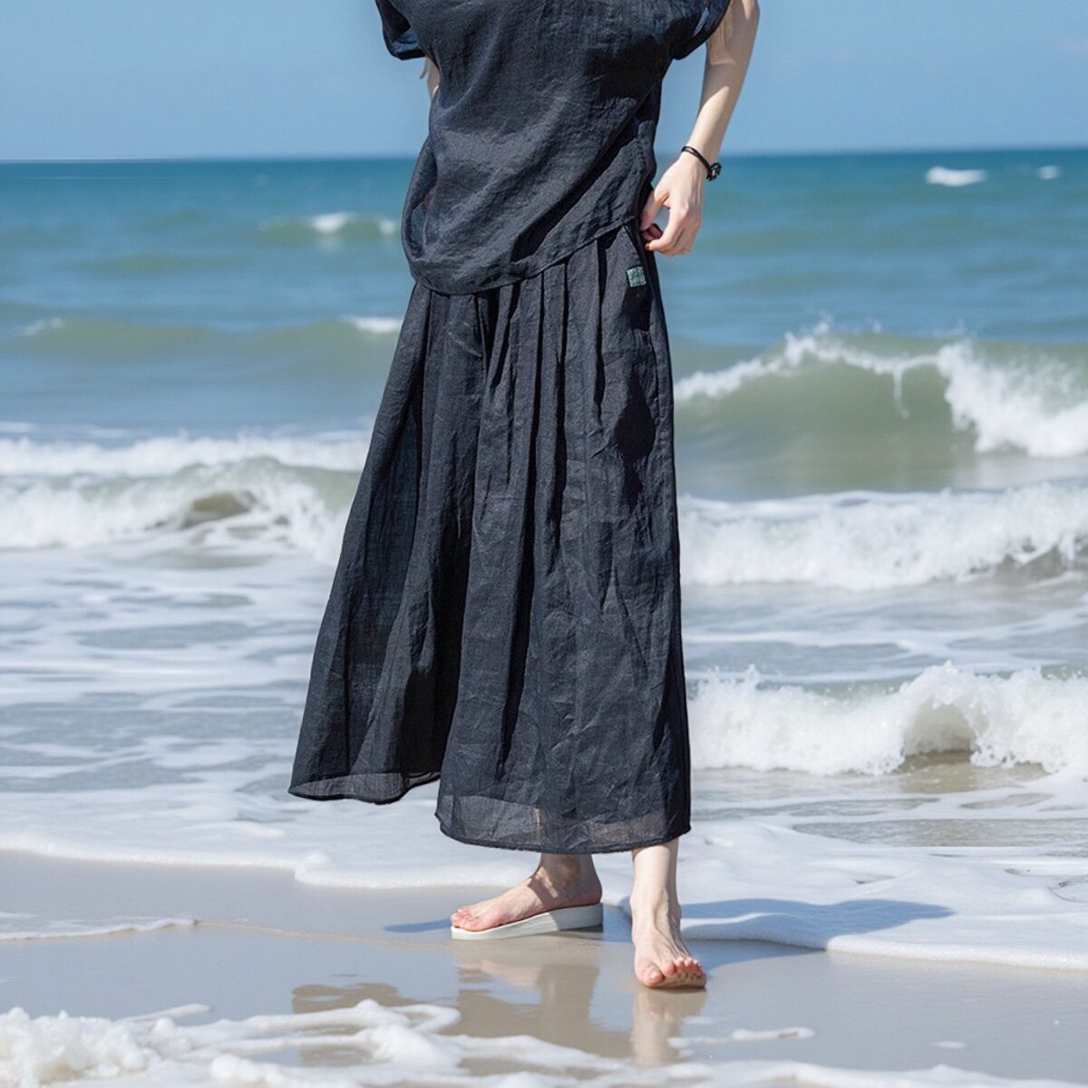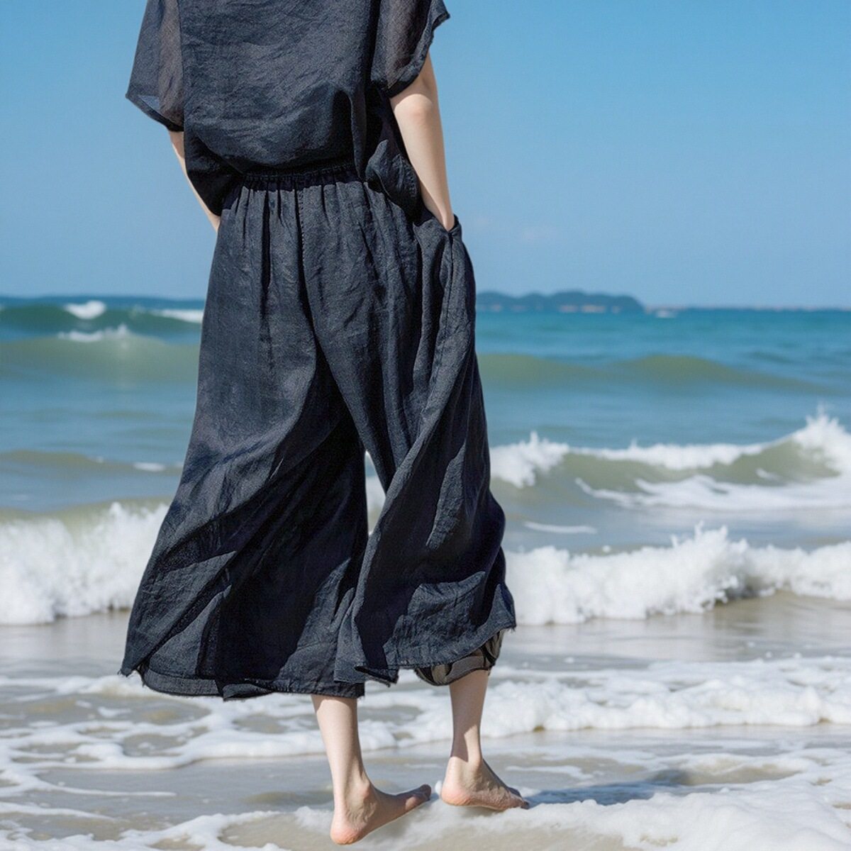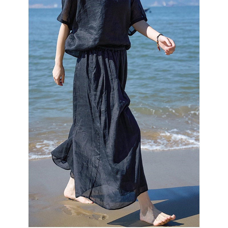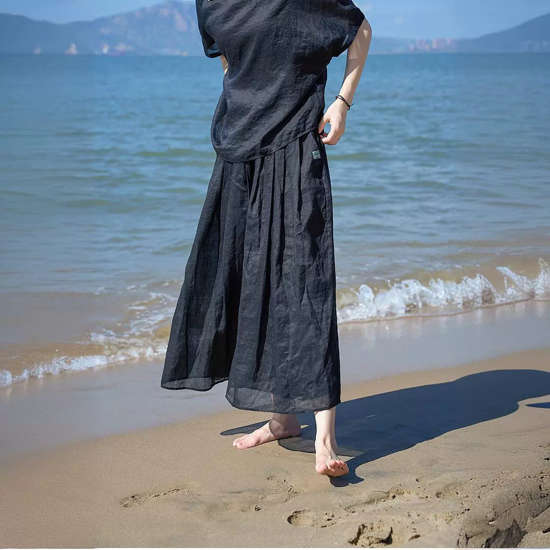套装 宽松裤 2025夏轻薄细腻松紧腰复古薄款 薰黑色细支苎麻八分裙裤