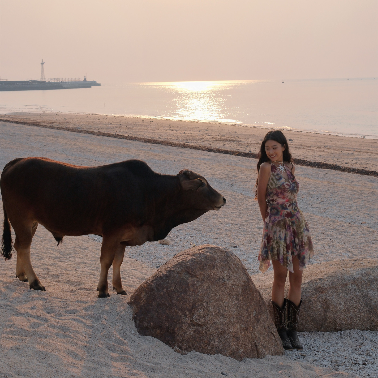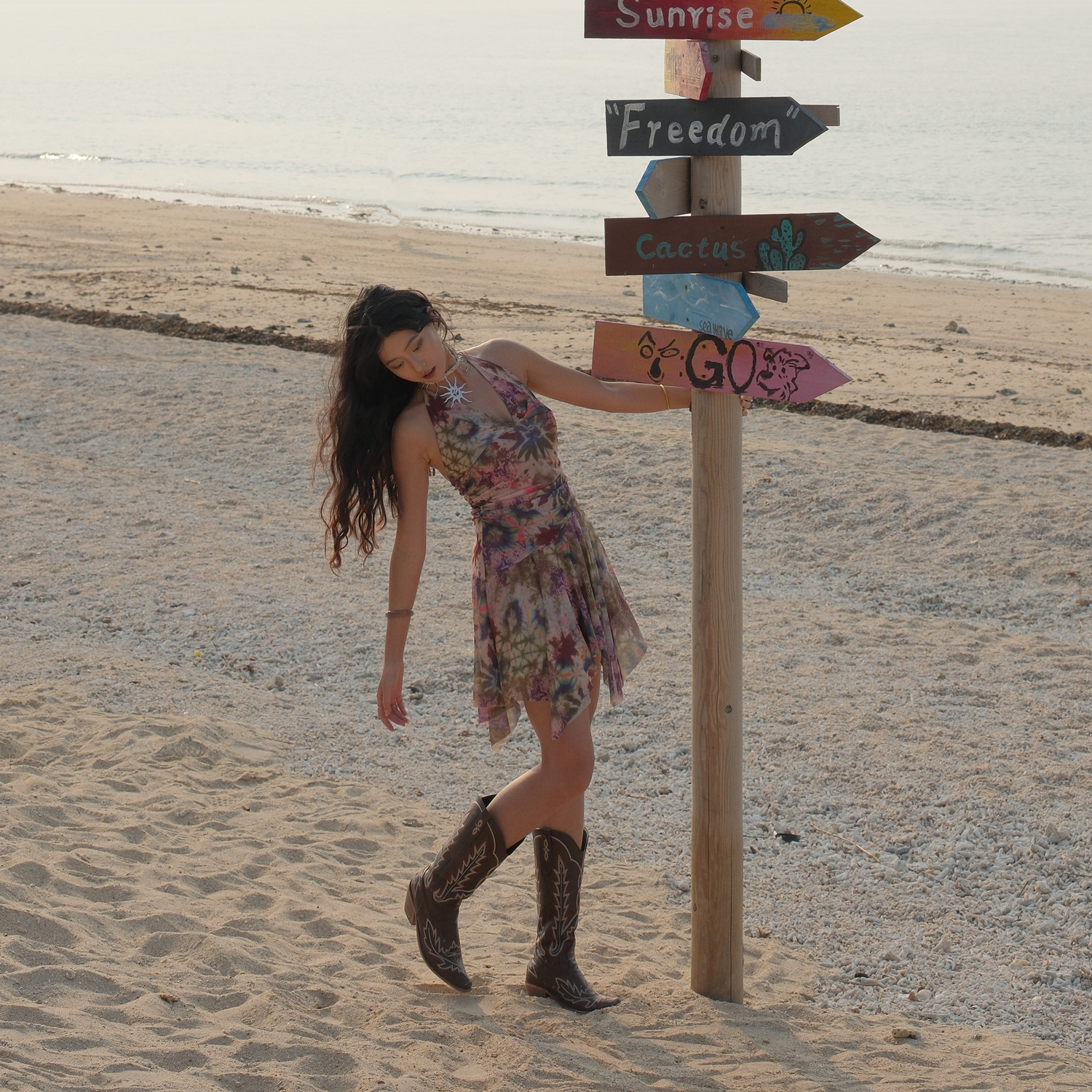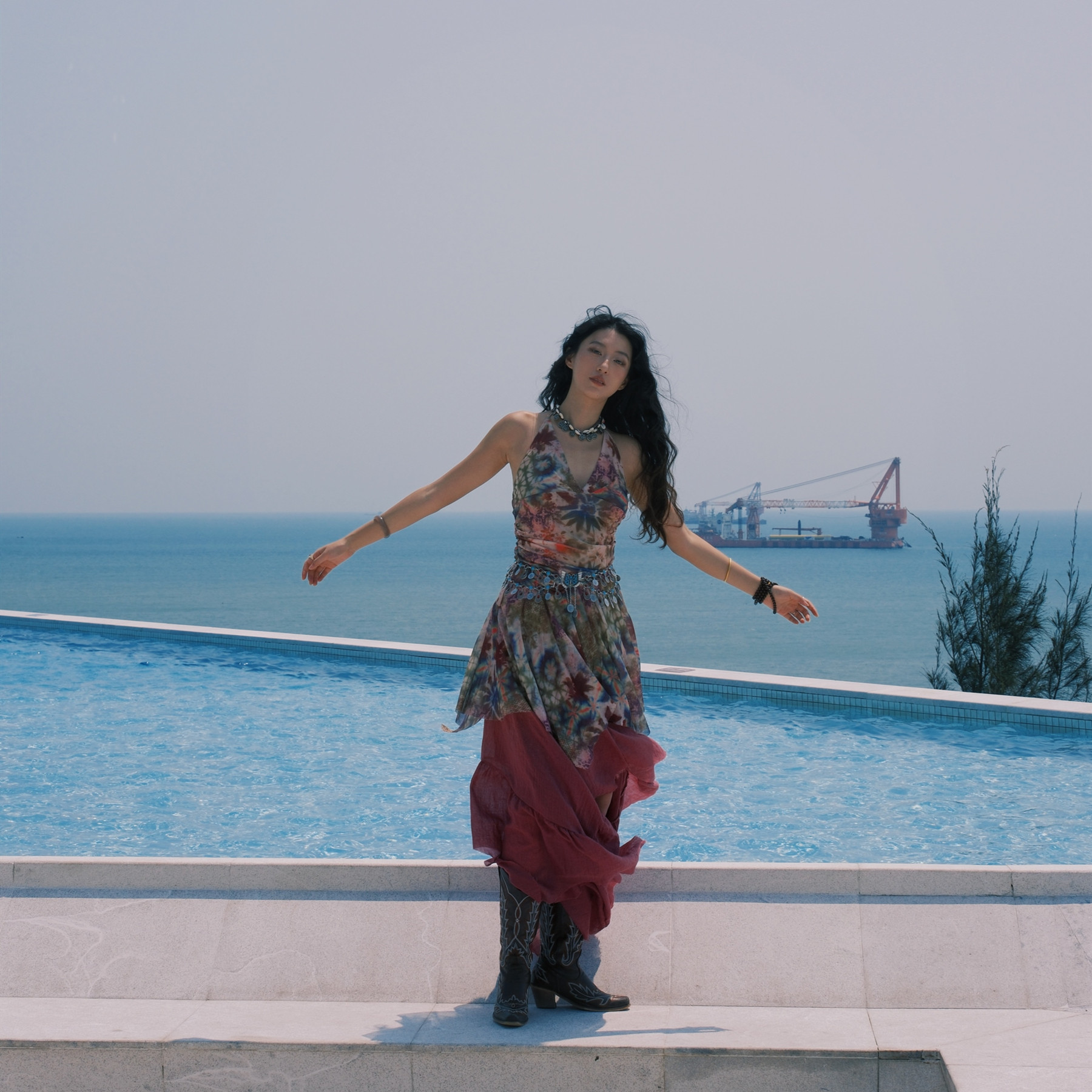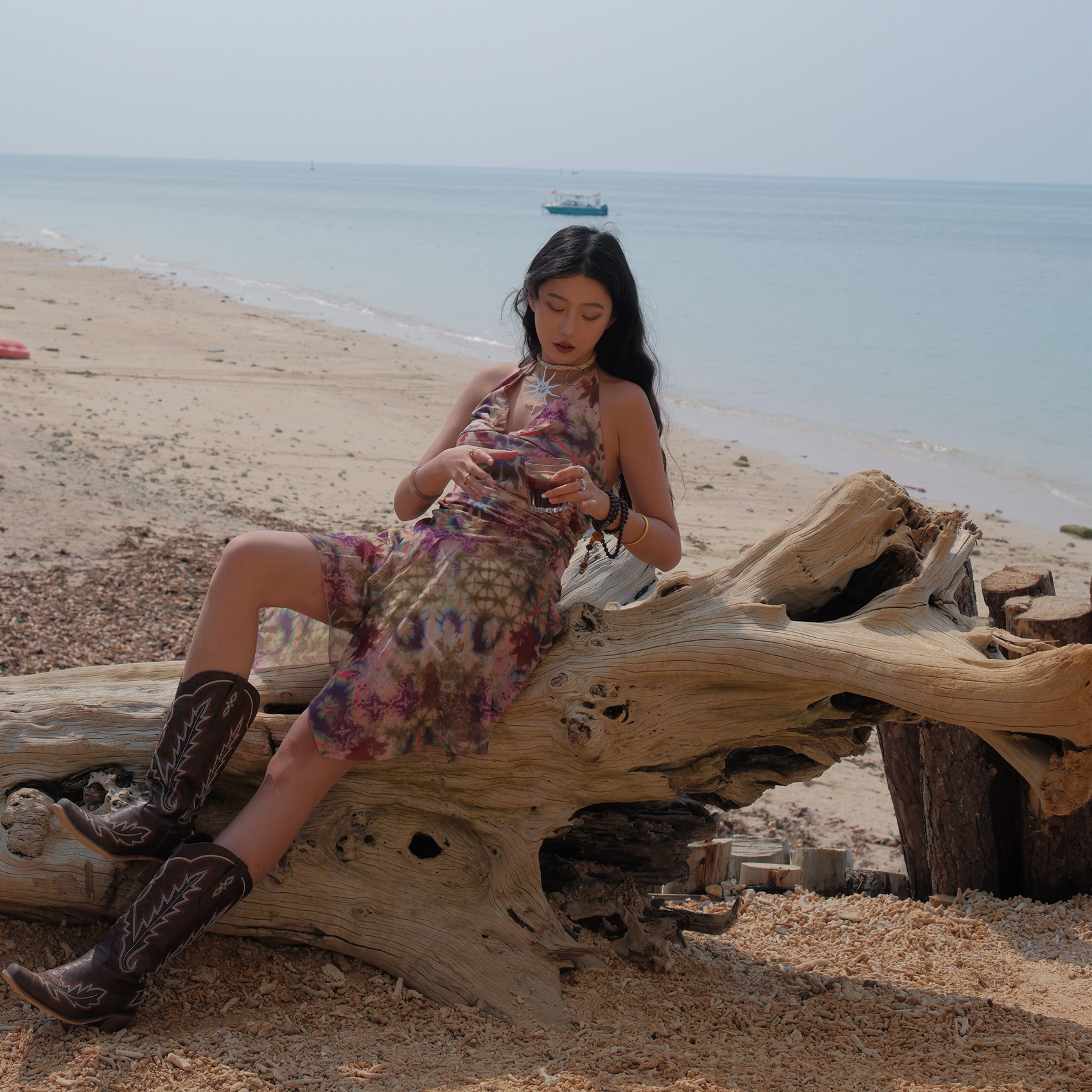猫之旅店南法度假短裙波西米亚扎染印花网纱小众不规则挂脖连衣裙