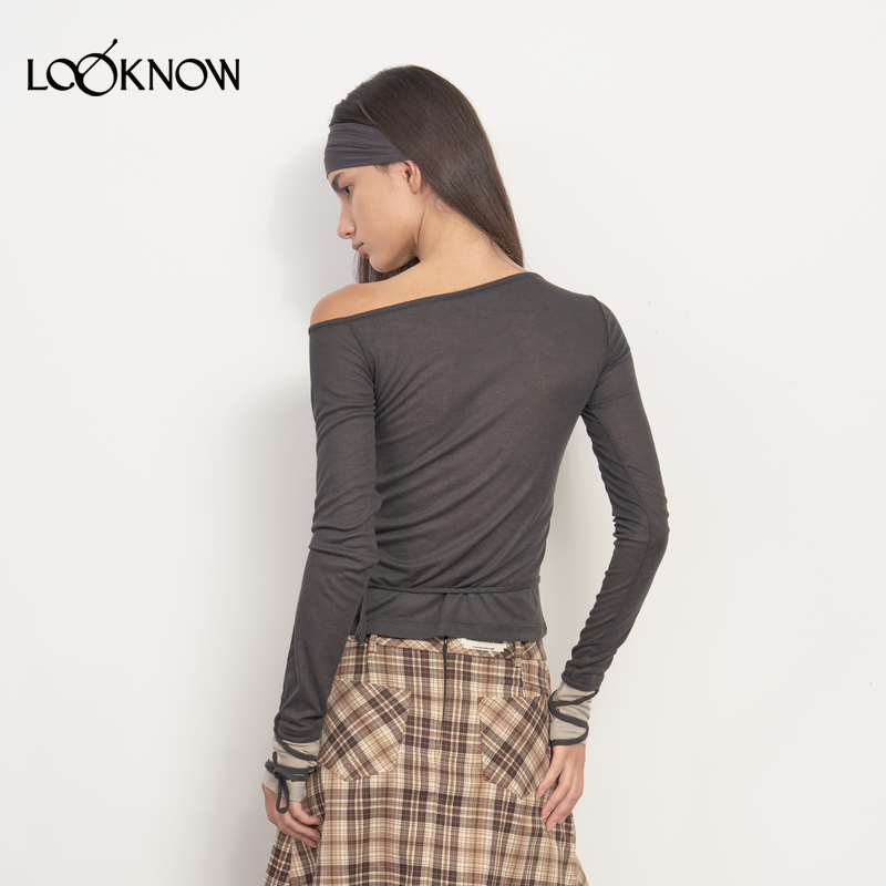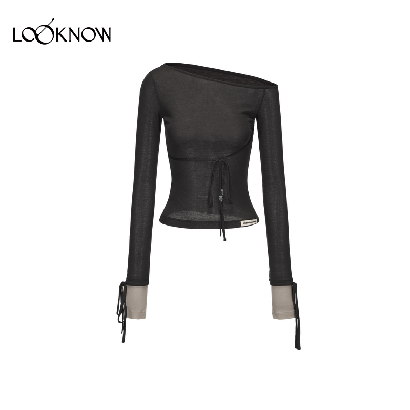 madeinormal设计师品牌LOOKNOW25春新款 T恤女 串珠斜肩打底长袖