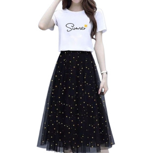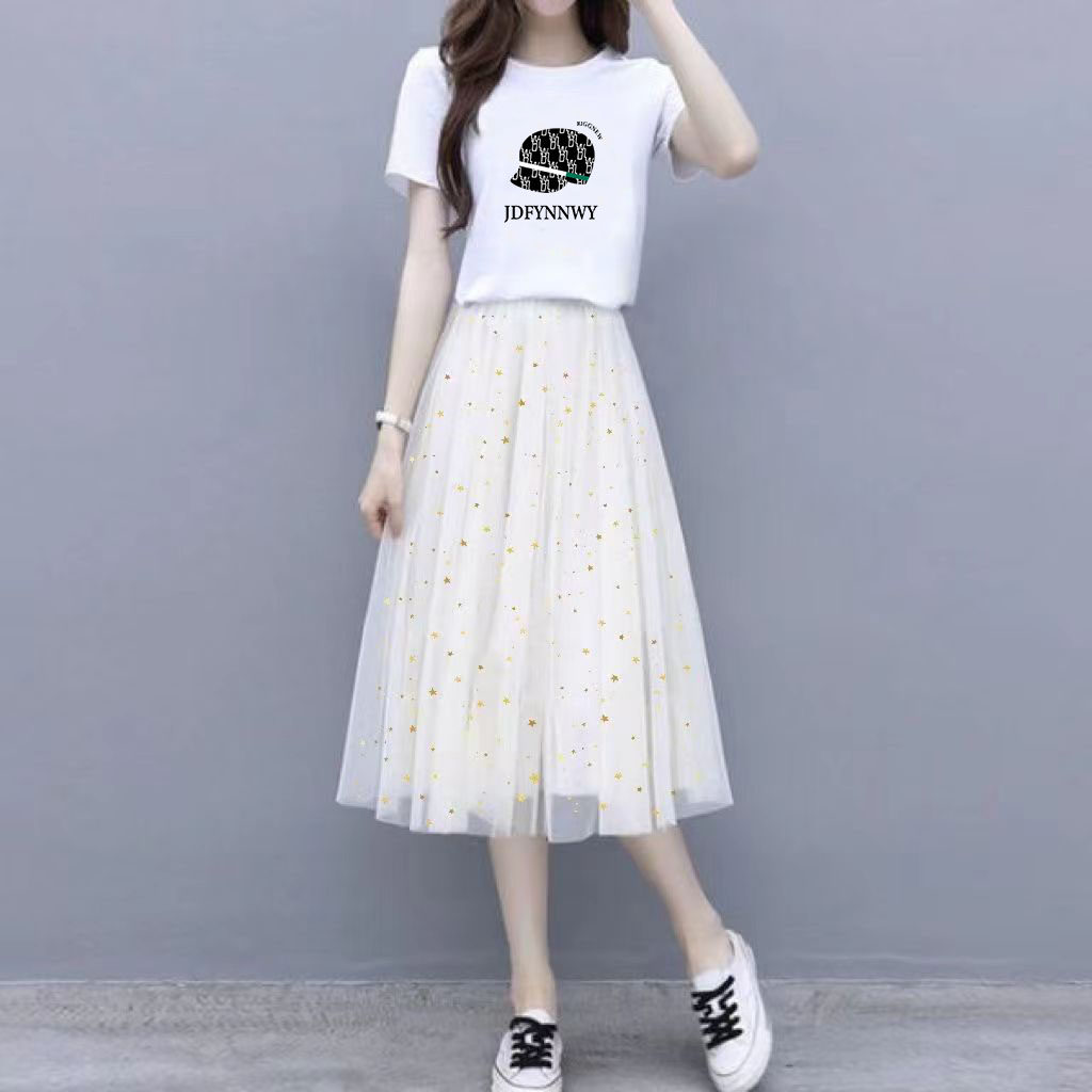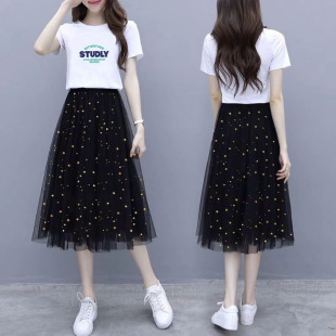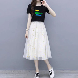 t恤网纱裙两件套上衣半身裙子女 2025新款 小个子连衣裙套装 女夏装