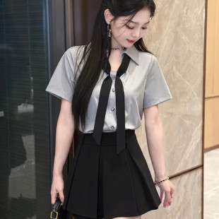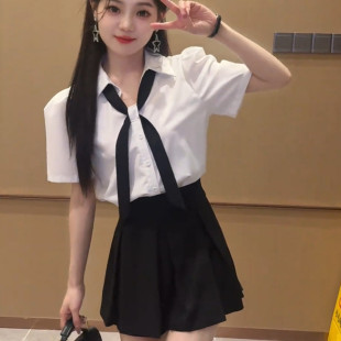 学院风甜美穿搭一整套女百搭休闲V领配领带短袖 半身裙两件套 衬衫