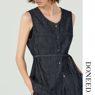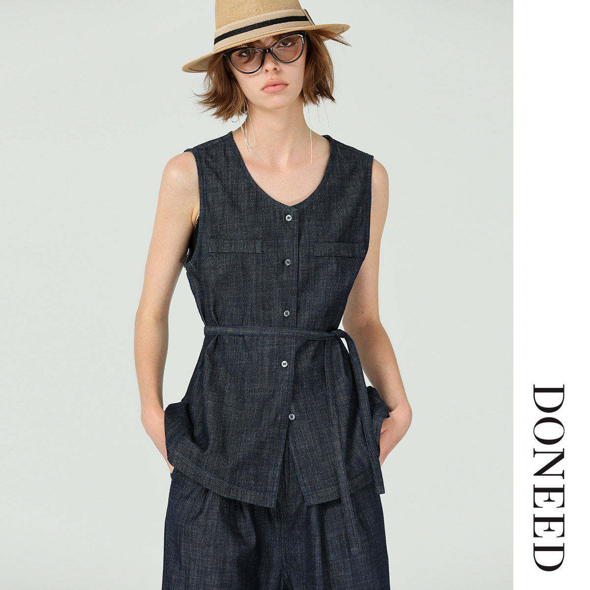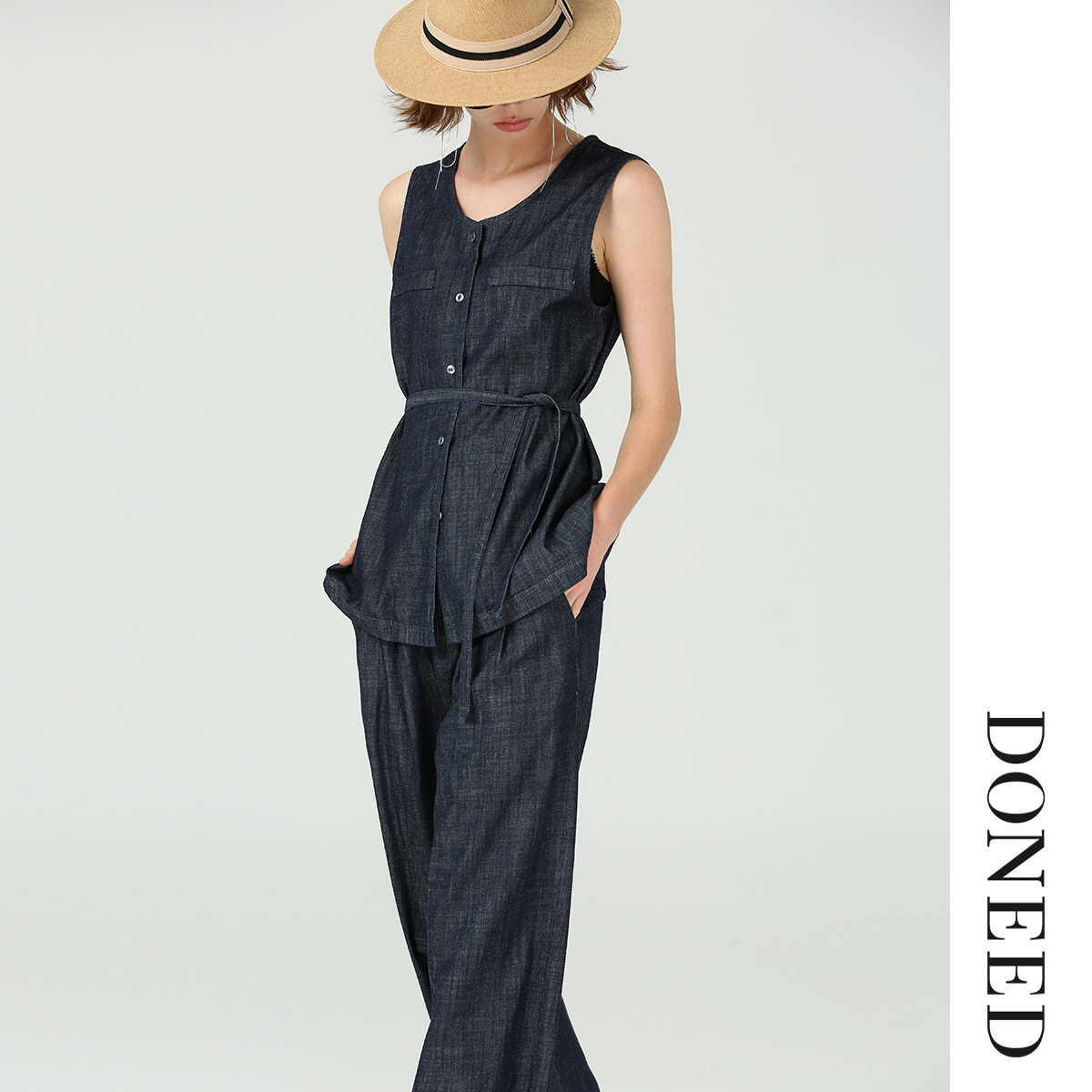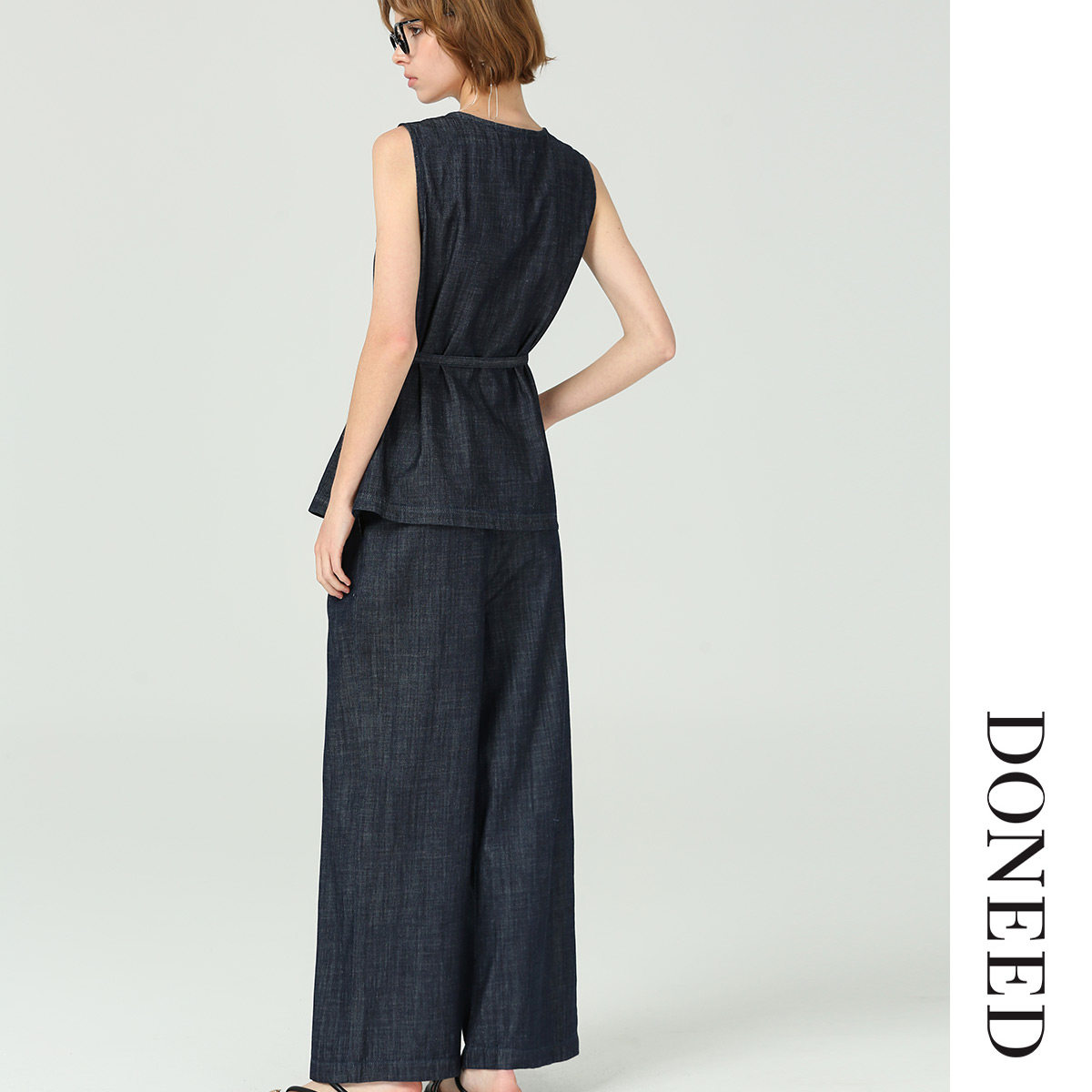 套装 DONEED夏款 配腰带牛仔马甲直筒长裤 圆领无袖 女 摩登时尚