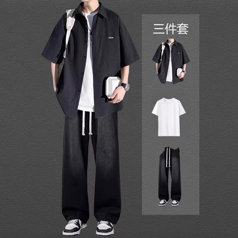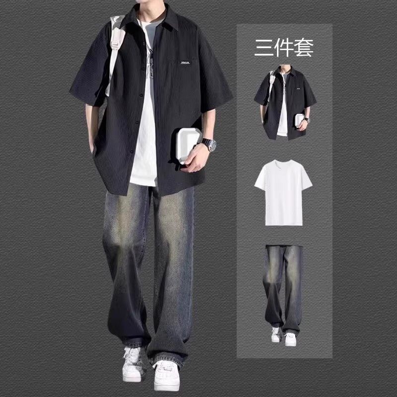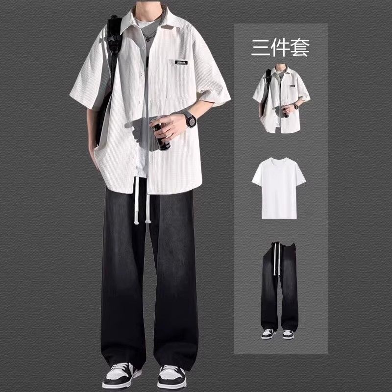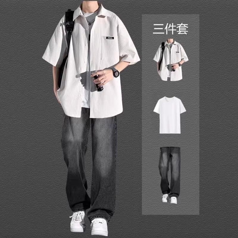 衬衫 衬衣外套青少年学生帅气穿搭三件套男装 男士 夏季 休闲套装 短袖