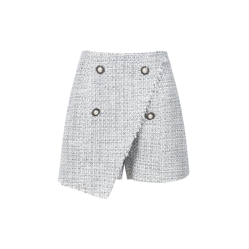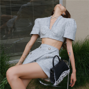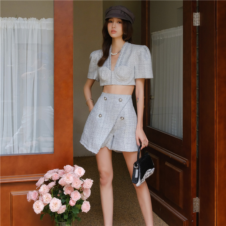 小香风短款 YCH V领上衣两件不规则裙式 短裤 木兰 套装 折