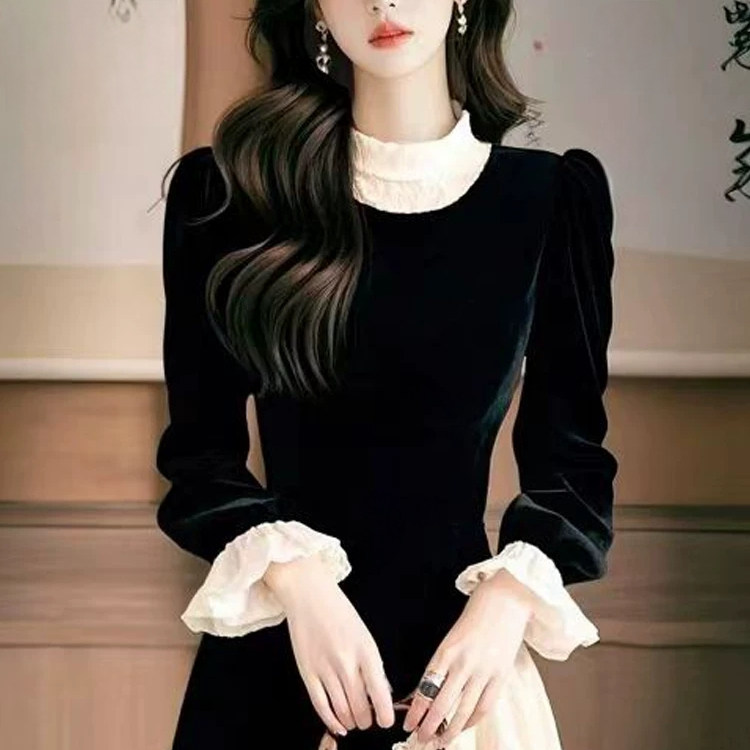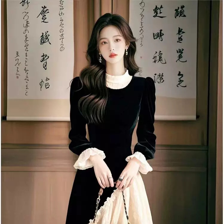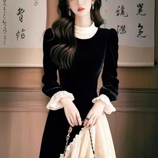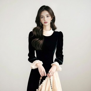 法式 高级感黑色蕾丝拼接丝绒连衣裙掐腰小黑裙冷淡系独特别致裙子