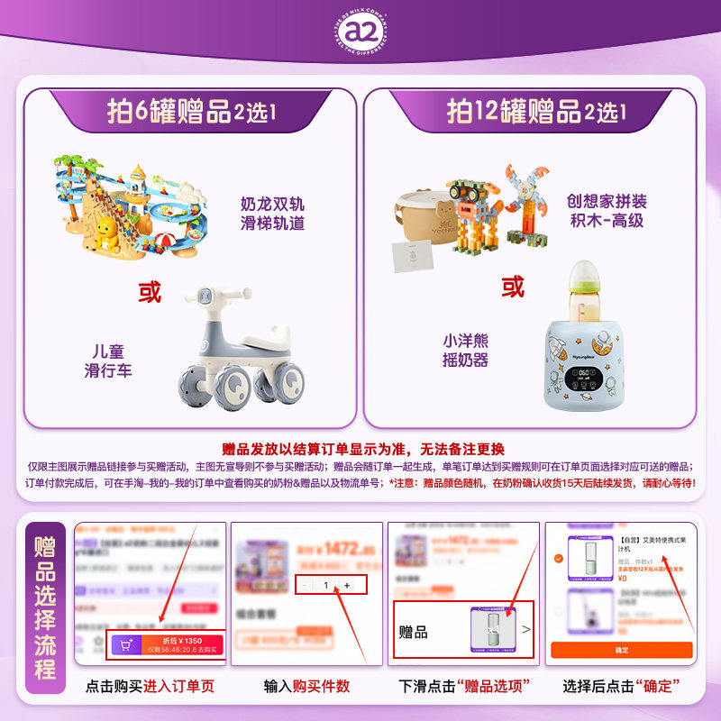 6罐 a2紫白金二段配方婴幼儿牛奶粉宝宝乳粉900g 自营