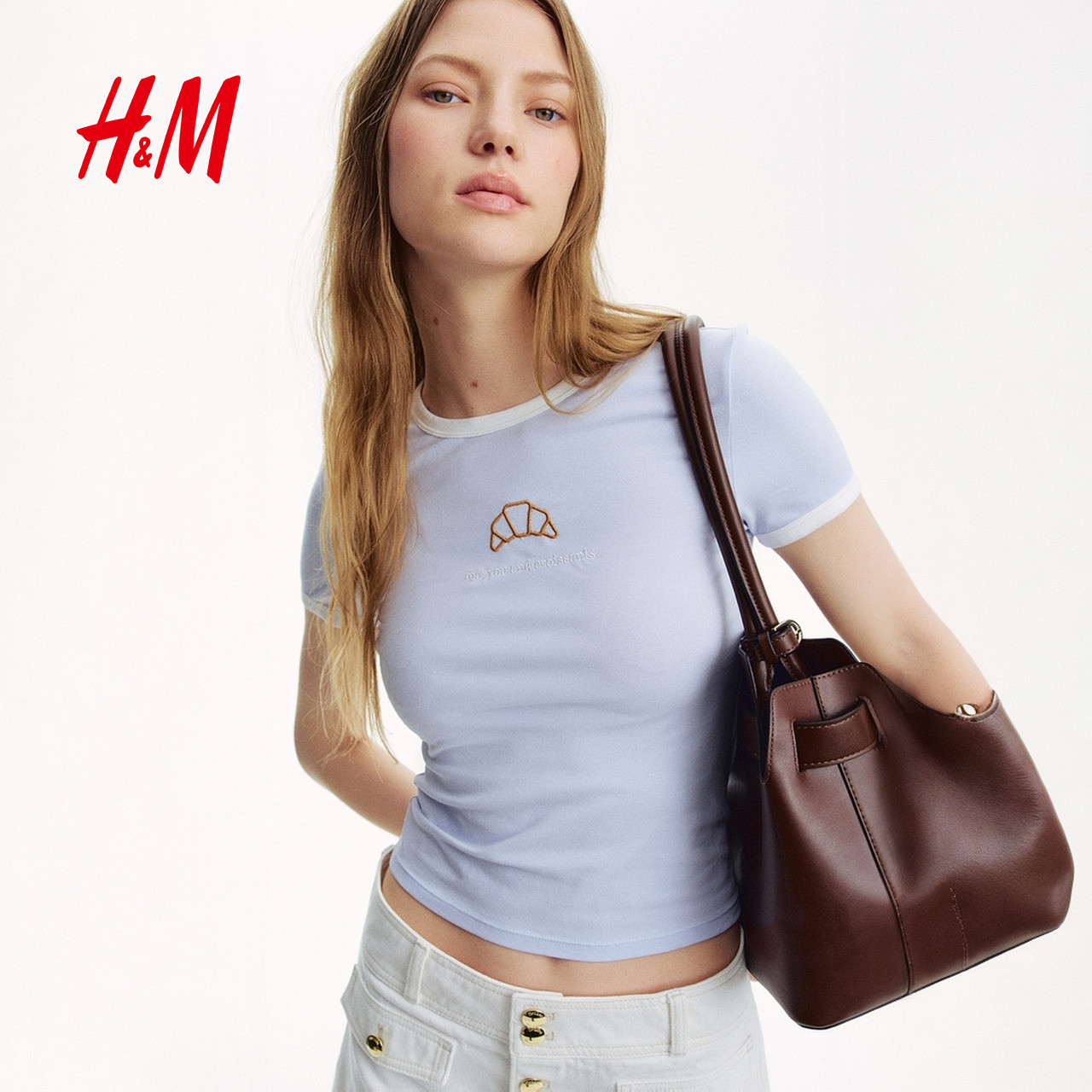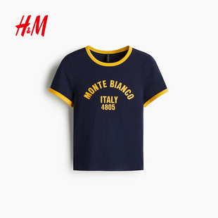 修身 HM女装 深红色棉质圆领短袖 新款 短上衣1296040 T恤2025年冬季