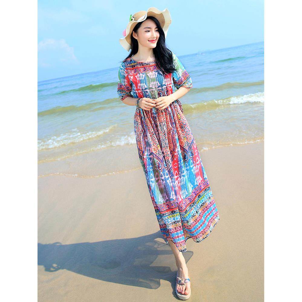 波西米亚大码 连衣裙宽松长裙 大摆夏雪纺显瘦海边度假沙滩裙中袖