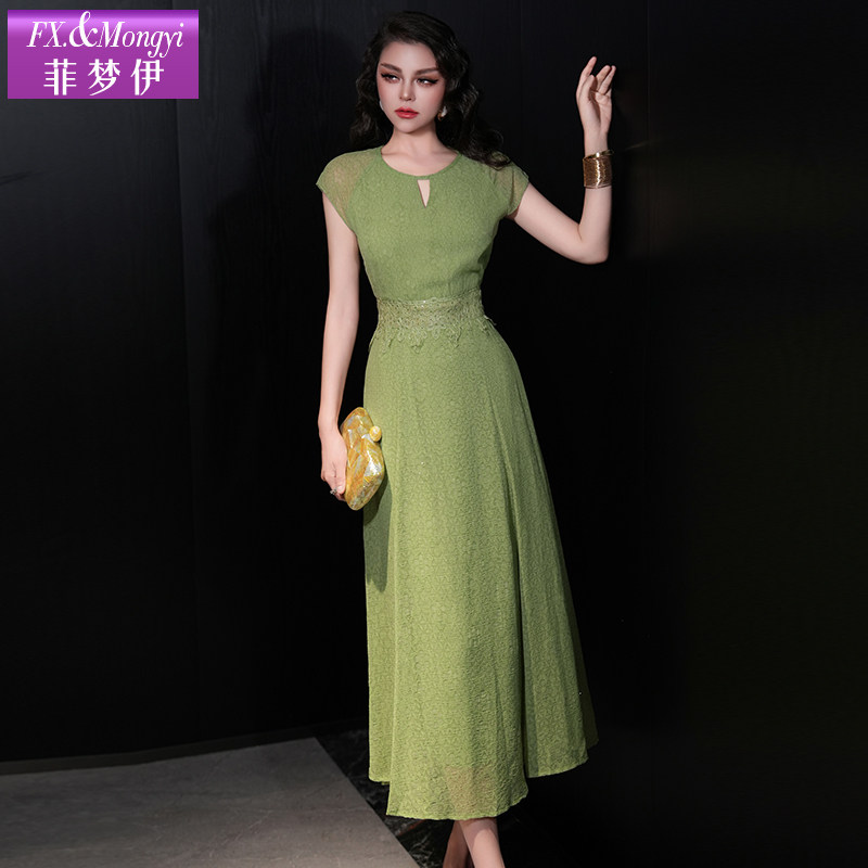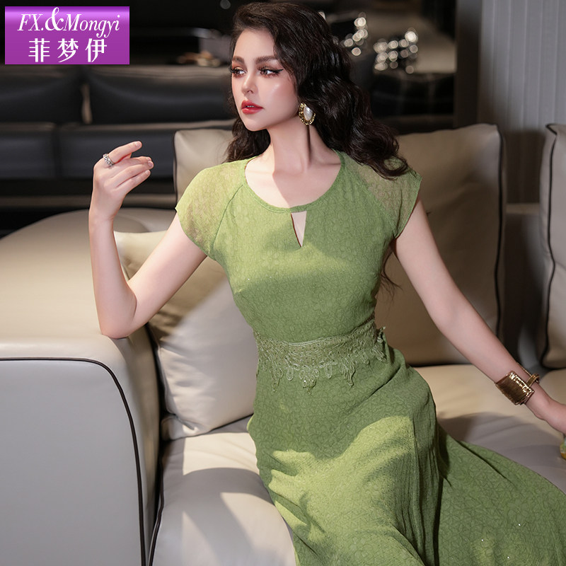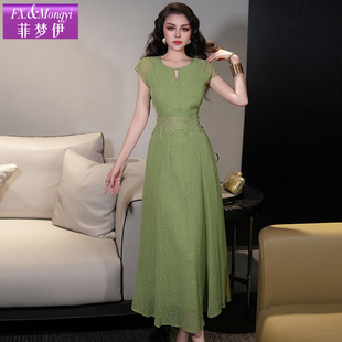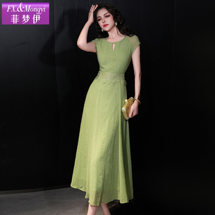 长裙子 高级感独特温柔名媛大码 菲梦伊蕾丝边绿色连衣裙女短袖 夏季